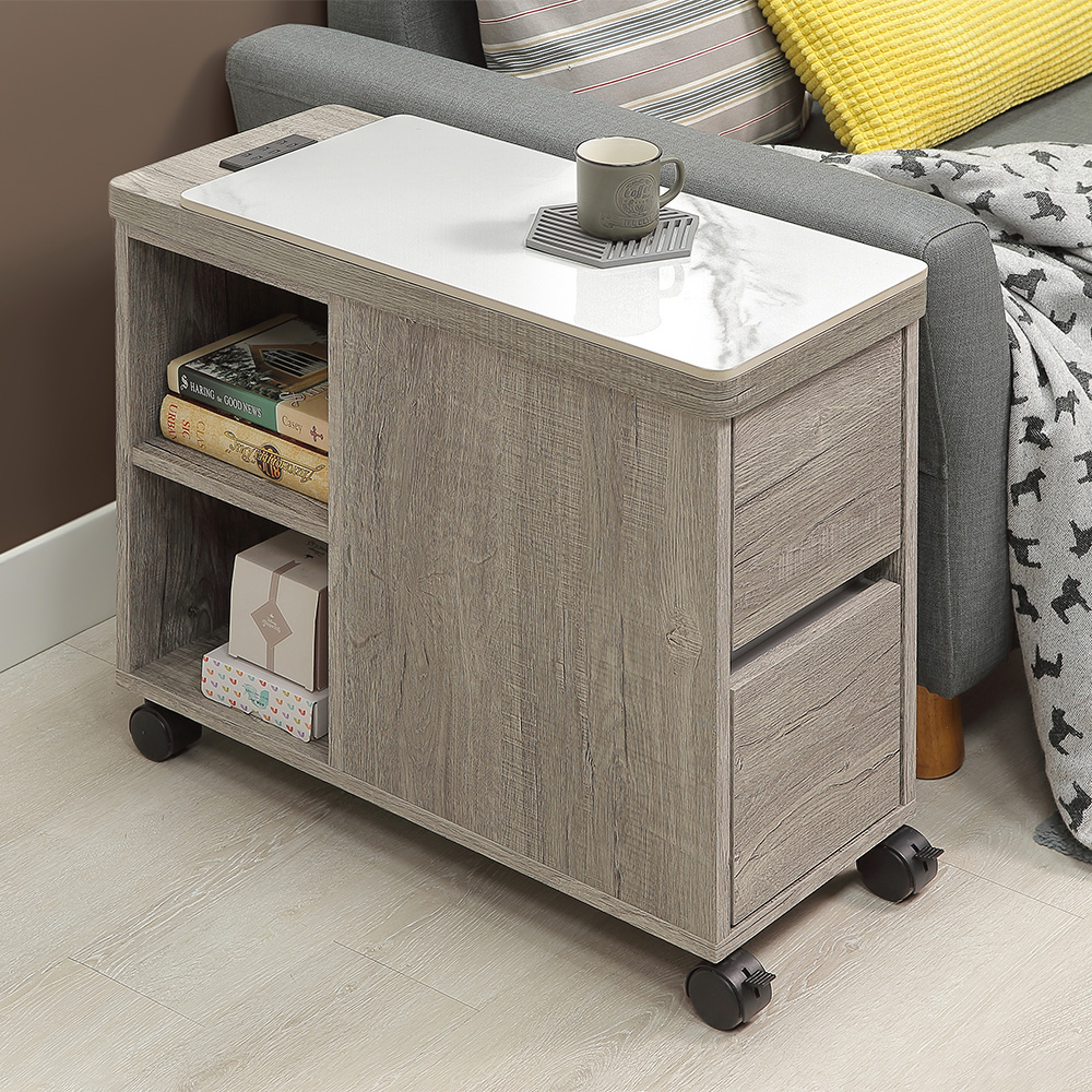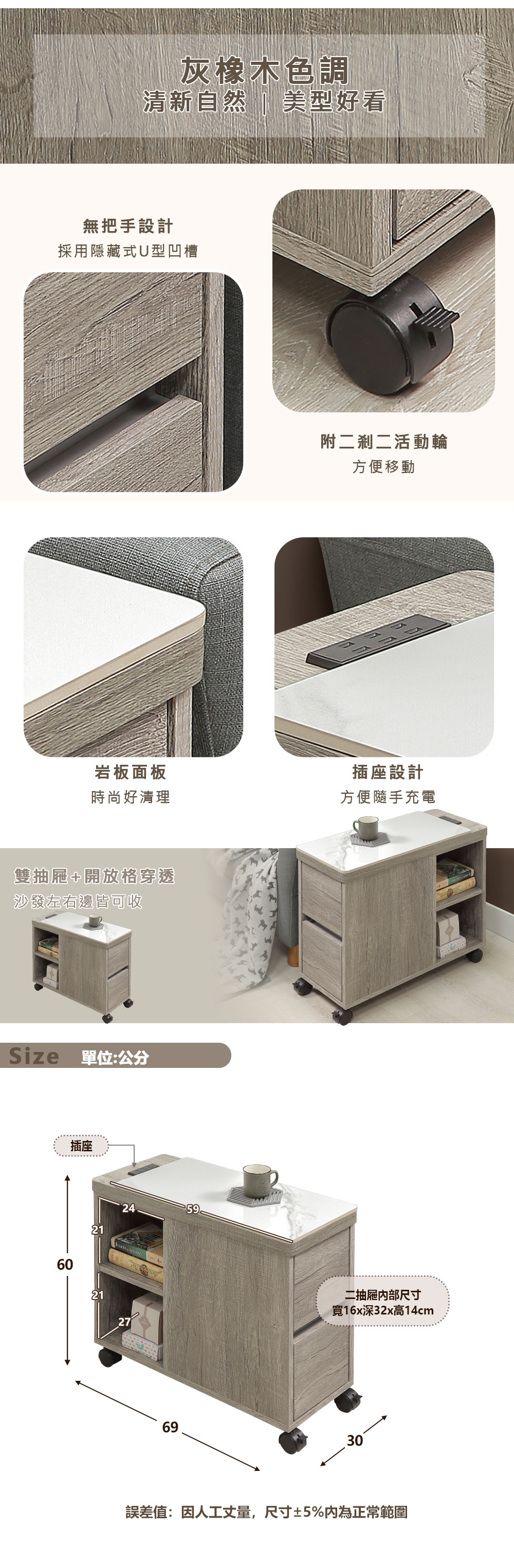◆無把手設計,採用隱藏式U型凹槽◆附二剎二活動輪,方便移動◆雙抽屜收納小物◆附插座充電,檯面岩板好清理◆灰橡色調風格◆安心配送,由專人到府組裝尺寸:寬 30 x 深 69 x 高 60 公分材質:高級木心板顏色:灰橡色產地:台灣誤差值:因人工丈量,尺寸±5%內為正常範圍