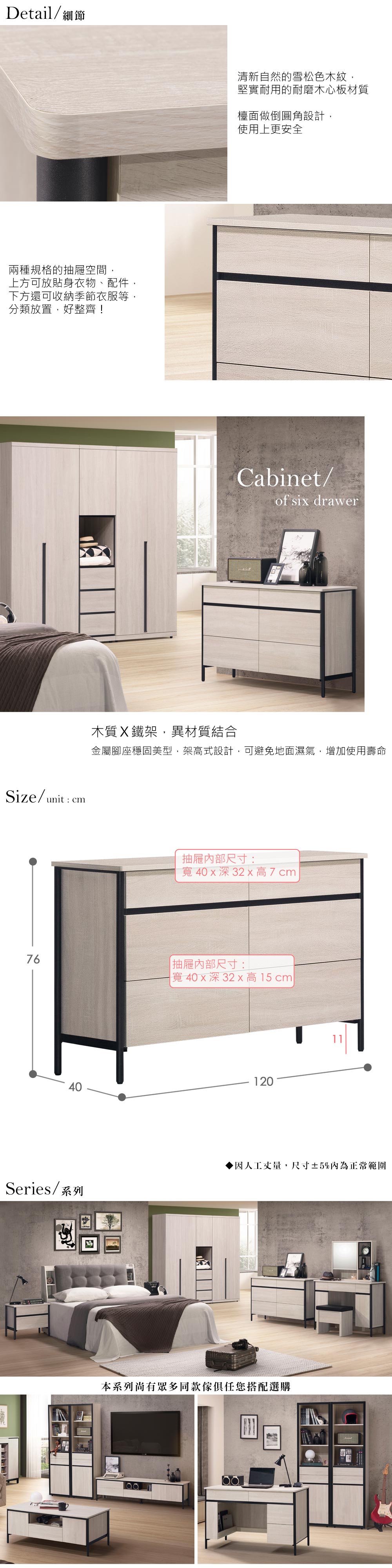 ◆清新自然的雪松色木紋◆檯面圓角設計,使用安全◆六抽屜收納空間,好實用◆免組裝專人配送到府◆輕工業、北歐自然+金屬風格◆客廳、臥室、書房存放萬物的經典商品◆挑高腳柱增加空間的寬敞感尺寸:寬 120 x 深 40 x 高 76 公分材質:高級木心板、烤黑鐵架顏色:白雪松產地:台灣誤差值:因人工丈量,尺寸±5%內為正常範圍