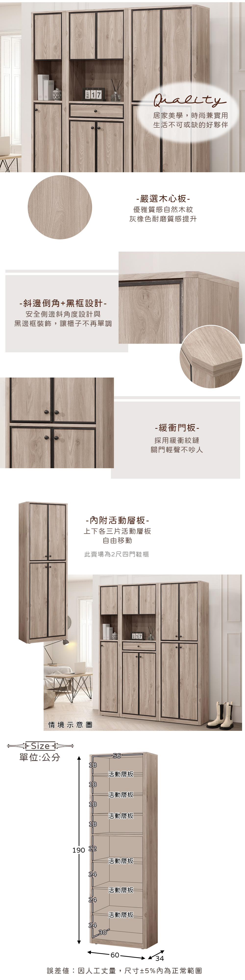 ◆百搭灰橡色澤,提升質感◆斜邊倒角+黑框設計◆緩衝門片,輕聲關門◆免組裝,由專人配送到府◆輕工業北歐風格◆八層收納空間尺寸:寬 60 x 深 34 x 高 190 公分材質:高級木心板顏色:灰橡色產地:台灣誤差值: 因人工丈量,尺寸±5%內為正常範圍