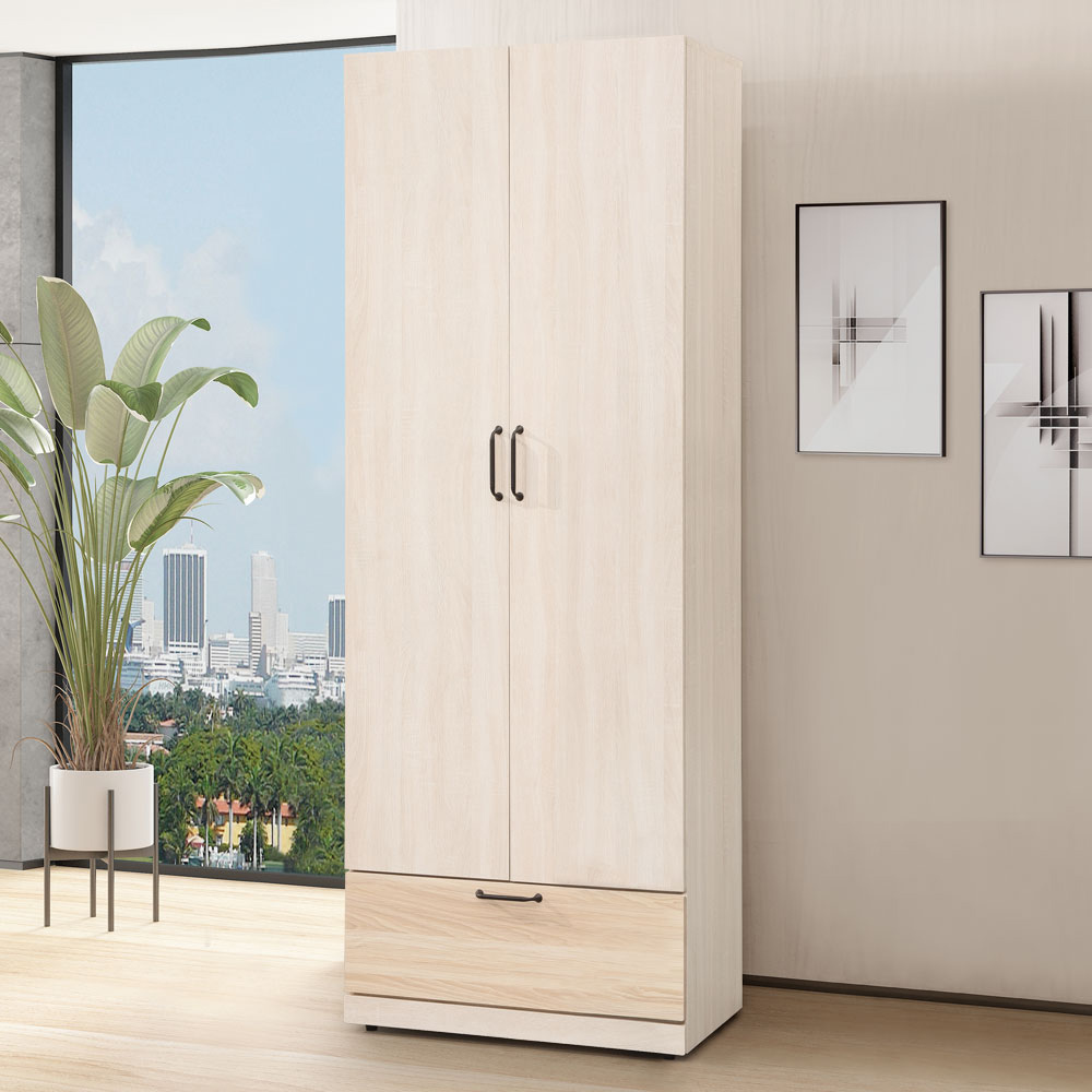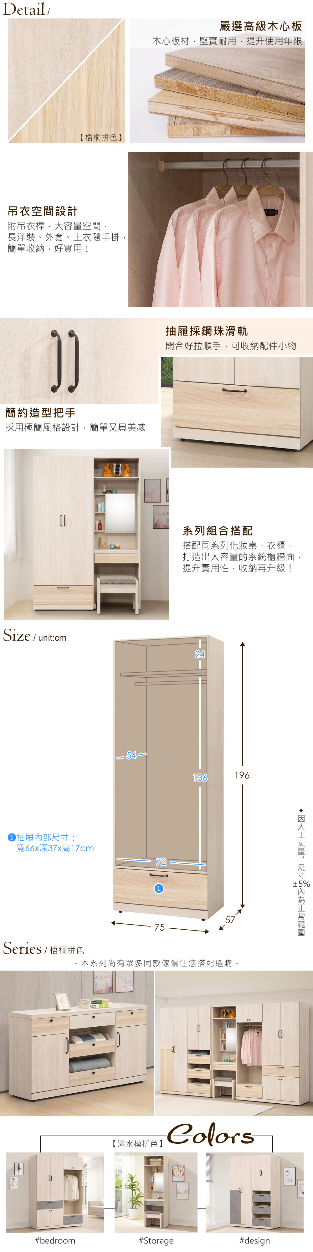 ◆質感雙拼色系,流行時尚◆大容量吊衣空間,好實用◆置物格+抽屜的多元收納設計◆免組裝,專人配送到府◆雪松vs.梧桐雙色調風格尺寸:寬 75 x 深 57 x 高 196 公分材質:高級木心板顏色:梧桐拼色產地:台灣誤差值:因人工丈量,尺寸±5%內為正常範圍
