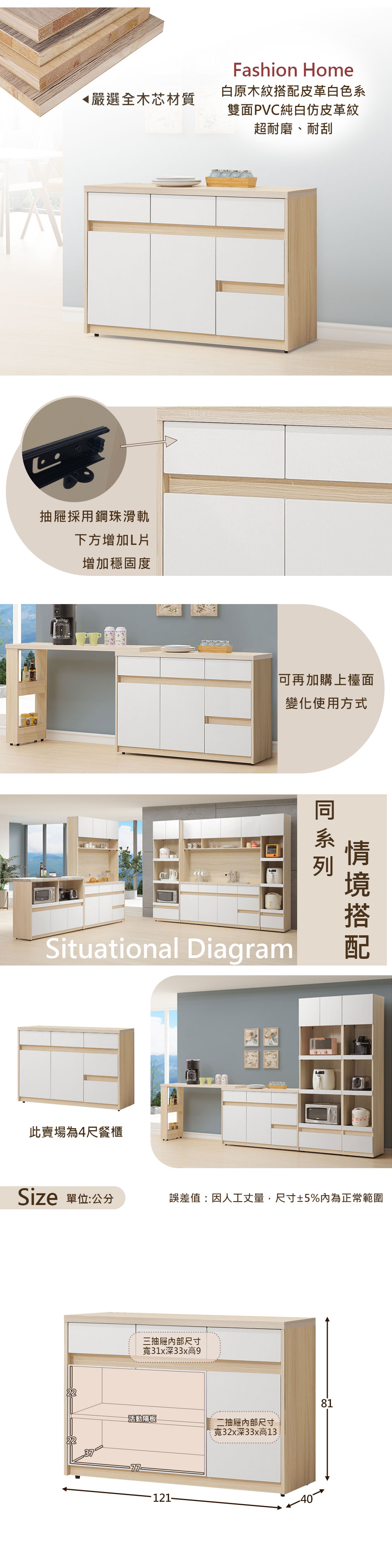 ◆嚴選高級的木心板材質◆五抽屜設計收納空間◆門櫃+抽屜,多元收納◆抽屜鋼珠滑軌,可收納廚房小物◆專人配送,到府組裝尺寸:寬 121 x 深 40 x 高 81公分材質:高級木心板顏色:原木+白色產地:台灣誤差值:因人工丈量,尺寸±5%內為正常範圍