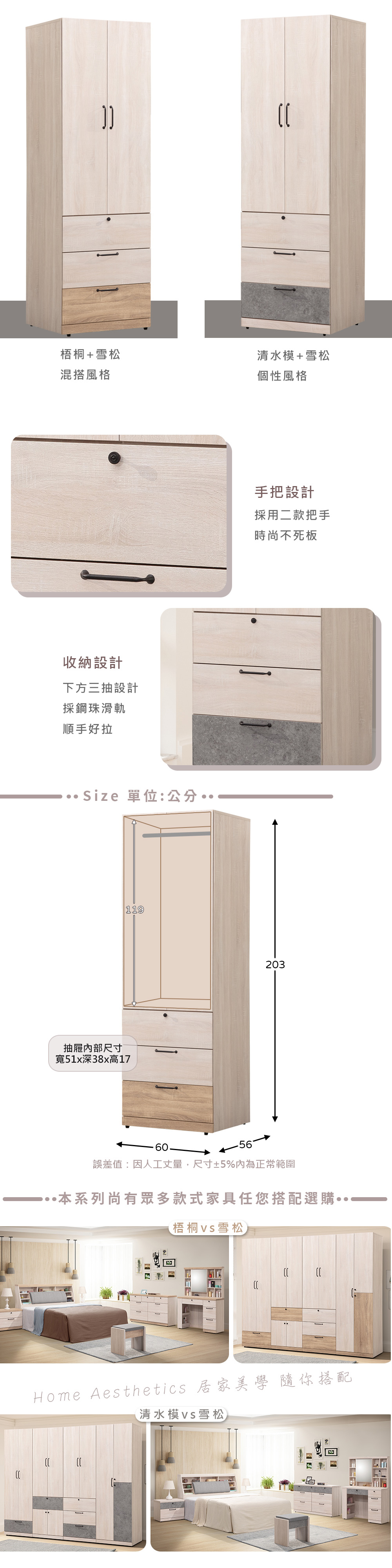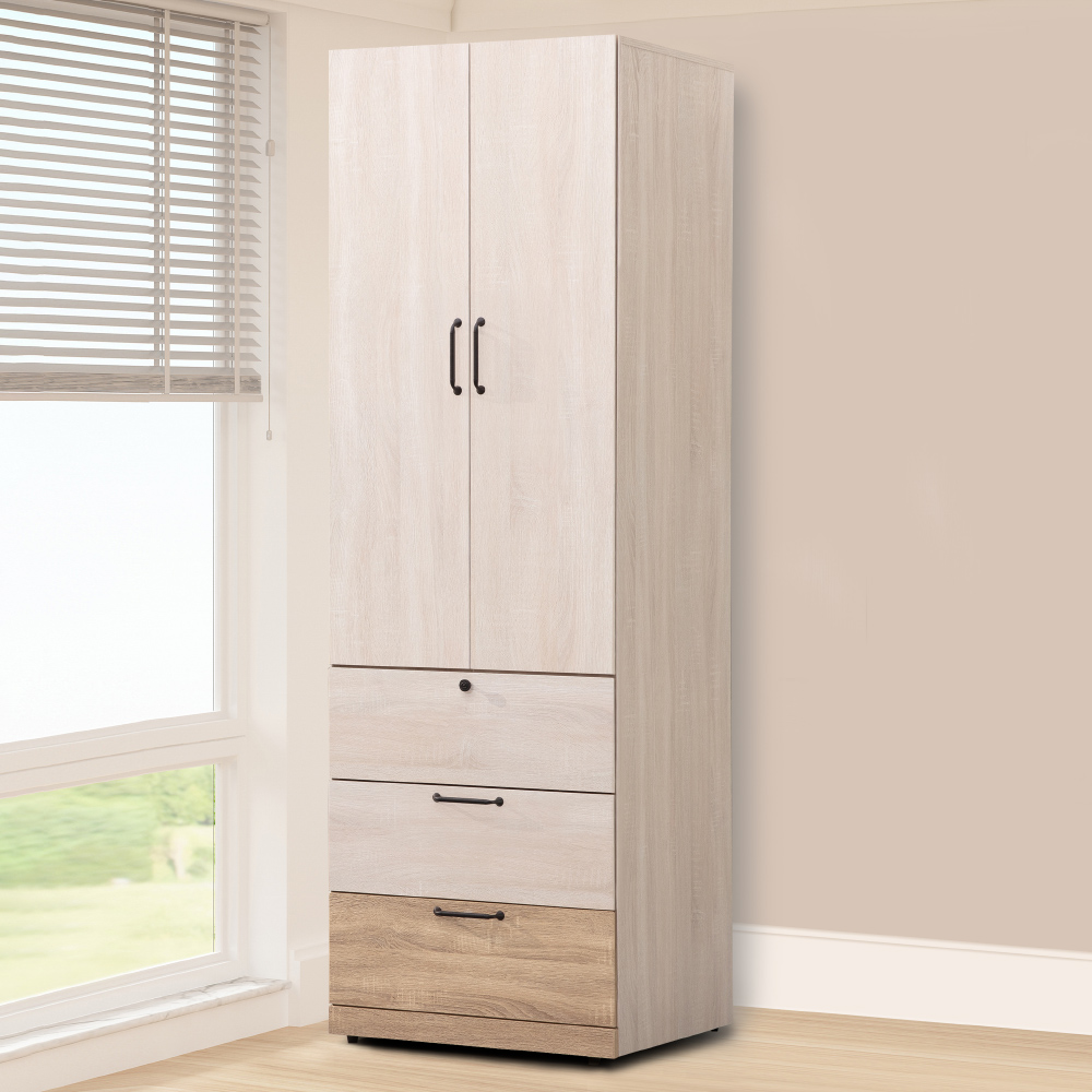 ◆嚴選高級木心板材質◆下方三抽設計◆油壓緩衝後鈕,不怕夾傷手◆免自行組裝,專人配送到府尺寸:寬 60 x 深 56 x 高 203 公分材質:高級木心板顏色:梧桐拼色產地:台灣誤差值:因人工丈量,尺寸±5%內為正常範圍
