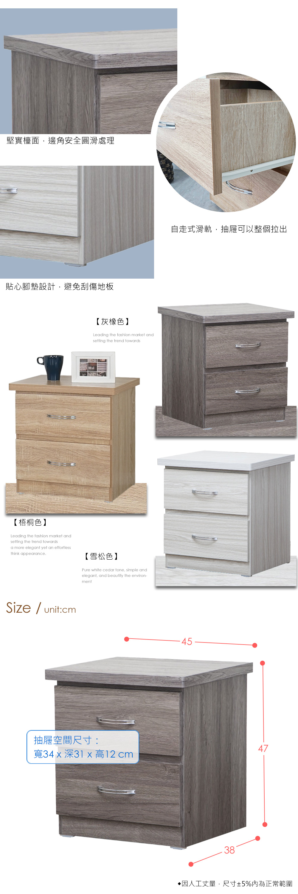 ◆清新自然的質感木紋肌理◆二抽屜空間,小物好收納◆免組裝傢俱,輕鬆好省時◆日式、簡約樸素風格◆臥室、客廳角落經典單品◆抽屜與收納快速存取尺寸: 寬 45 x 深 38 x 高 47 公分材質:高密度塑合板(表面防刮耐磨處理)顏色: 梧桐色、雪松色、灰橡色產地: 台灣誤差值:因人工丈量,尺寸±5%內為正常範圍