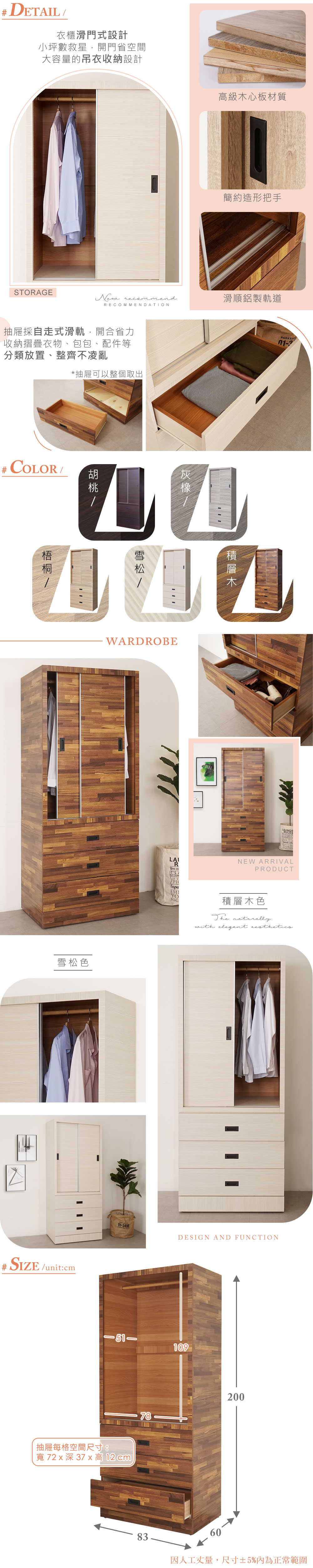 ◆嚴選高級的木心板材質◆大容量的吊衣空間設計◆三抽屜的分層收納規劃◆免組裝,專人配送到府◆簡約風、現代風◆臥室收納衣櫥,衣物收納◆上方推拉門設計,減少空間浪費◆下方三抽設計尺寸:寬 83 x 深 60 x 高 200 公分材質:高級木心板顏色:積層木產地:台灣誤差值:因人工丈量,尺寸±5%內為正常範圍