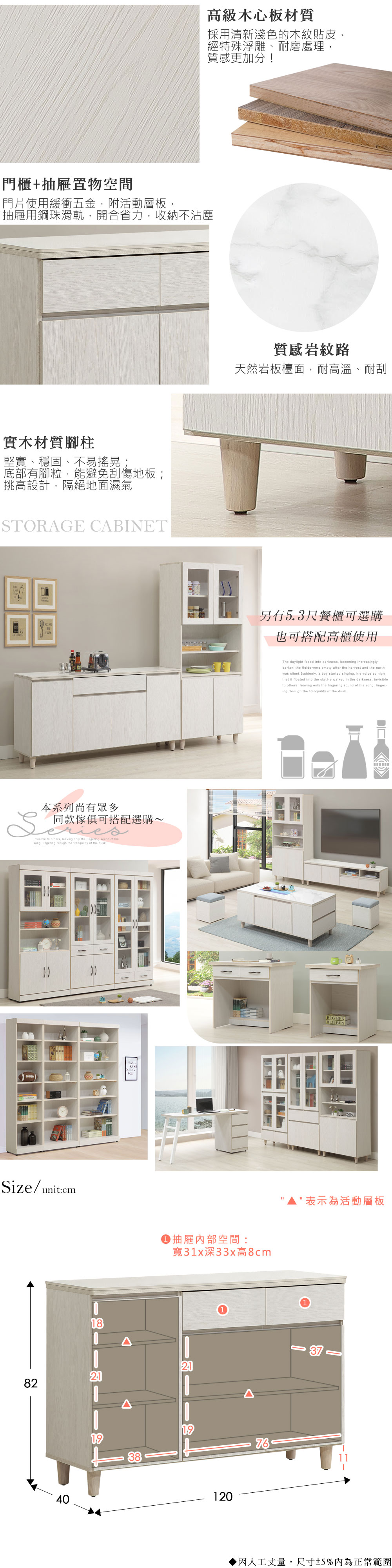 ◆天然岩板檯面,耐高溫、耐刮◆嚴選高級木心板◆附活動層板,置物更實用◆門片做緩衝設計,減少關門噪音◆二抽屜設計,可放各式小物品◆清新的淺色系搭配自然木紋肌理◆免自行組裝,專人配送到府尺寸:寬 120 x 深 40 x 高 82 公分材質:高級木心板、天然岩板顏色:白杉木色產地:台灣誤差值:因人工丈量,尺寸±5%內為正常範圍