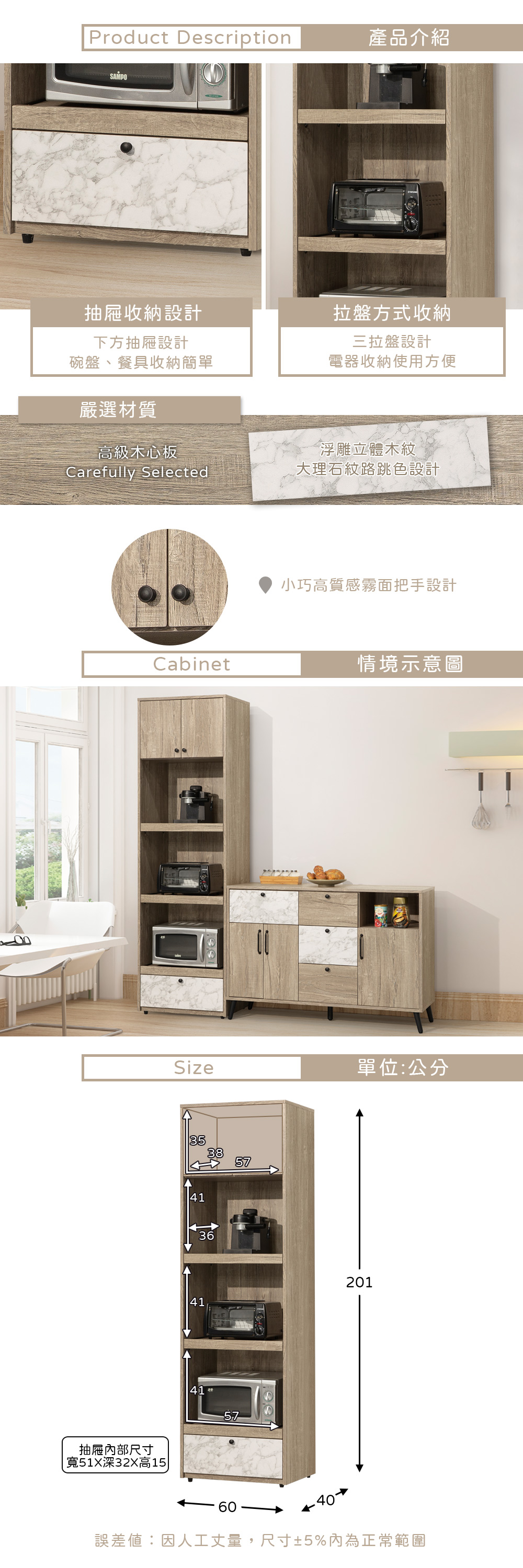 ◆油壓緩衝後鈕,不怕夾傷手◆拉盤設計, 電器使用方便◆木紋x大理石紋,蹦出新風格◆免自行組裝,專人配送到府◆鄉村、田野梧桐原木風格◆單抽屜+三拉盤 多層設計◆可當餐櫃、高櫃、電器收納櫃、廚櫃尺寸:寬 60 x 深 40 x 高 201 公分材質:高級木心板顏色:灰橡木色產地:台灣誤差值:因人工丈量,尺寸±5%內為正常範圍