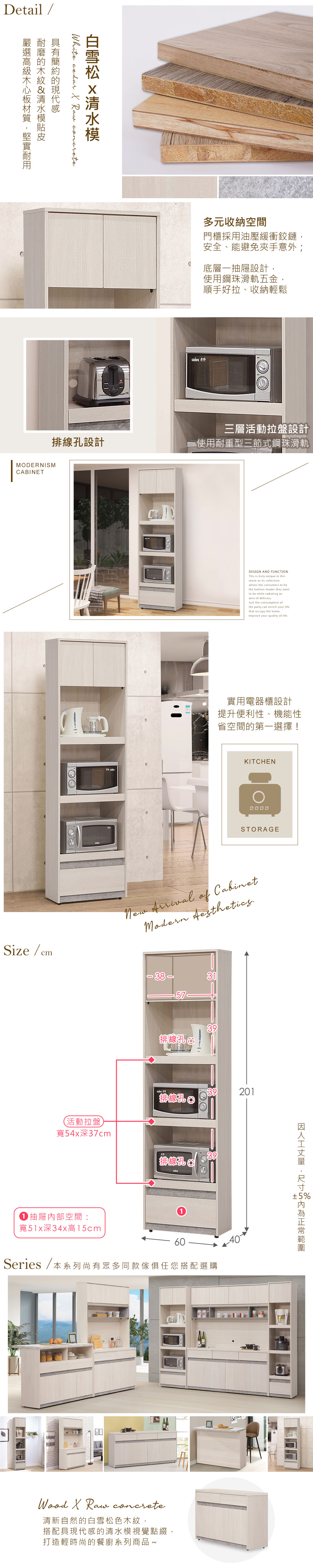 ◆嚴選高級的木心板材質◆三層拉盤設計,附排線孔◆門櫃+抽屜,多元收納◆免組裝,專人配送到府◆清新木紋x清水模拼色◆抽屜鋼珠滑軌,可收納廚房小物◆三拉盤 採用三節式鋼珠滑軌,承重超給力◆可當餐櫃、置物櫃、碗盤收納櫃、高櫃尺寸:寬 60 x 深 40 x 高 201 公分材質:高級木心板顏色:白雪松+清水模產地:台灣誤差值:因人工丈量,尺寸±5%內為正常範圍