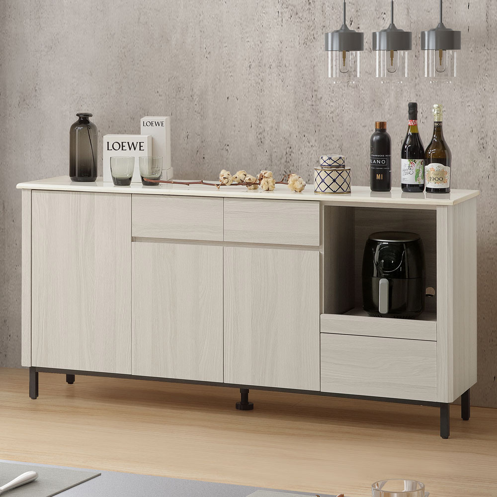 ◆木心板材質,堅實、穩固、耐用◆清新淺色系,質感木紋路視覺◆餐櫃檯面岩板材質,防刮、耐磨、好清潔◆門片使用緩衝五金,開合安全、避免夾手◆門櫃+抽屜的防塵收納規劃◆拉盤設計,附排線孔,可放餐廚電器◆免組裝,專人配送到府尺寸:寬 158 x 深 40 x 高 80 公分材質:高級木心板、岩板、鐵腳顏色:白榆木色產地:台灣誤差值:因人工丈量,尺寸±5%內為正常範圍