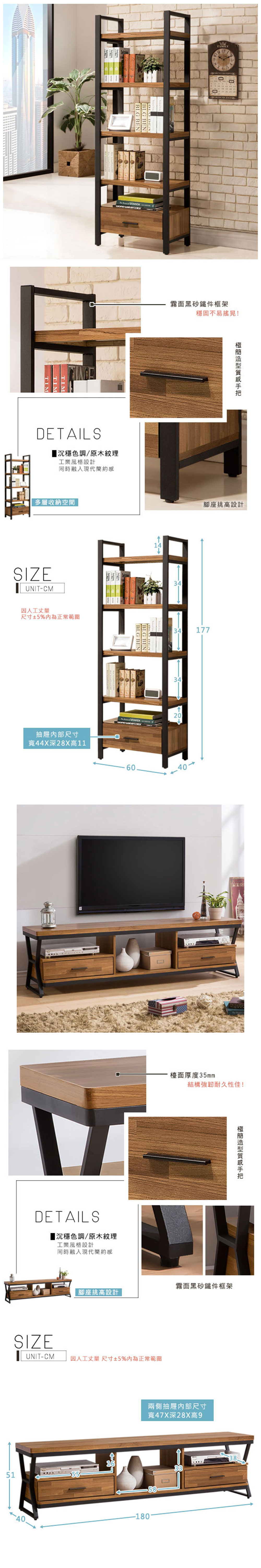 ◆沉穩色調原木紋理◆現代工業風格設計◆開放式置物大空間◆免組裝專人配送到府◆工業風格+柚木色調◆高櫃,五層開放格+一抽屜收納◆電視櫃,二層開放格+二抽屜整組配件:2尺書架+6尺電視櫃尺寸─書架:寬 60 x 深 40 x 高 177 cm電視櫃:寬 180 x 深 40 x 高 51 cm材質─ 高級木心板、高碳鋼管顏色─ 原木色產地─ 台灣誤差值─ 因人工丈量,尺寸±5%內為正常範圍