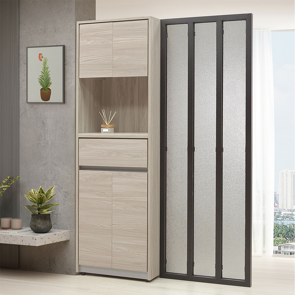 ◆無把手設計,採用隱藏式U型凹槽◆銀霞玻璃屏風設計◆單抽屜收納小物◆採用緩衝後鈕,降低碰撞聲◆清新雪杉色調風格◆安心配送,由專人到府組裝尺寸:寬 127 x 深 40 x 高 191 公分材質:高級木心板+銀霞玻璃顏色:雪杉色產地:台灣誤差值:因人工丈量,尺寸±5%內為正常範圍