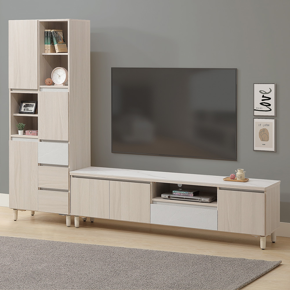 ◆抽屜+門櫃+開放格設計◆挑高腳,隔離地面濕氣◆岩板檯面,耐高溫耐刮◆抽屜採用鋼珠滑軌設計◆緩衝門板,可減少噪音◆質感美耐皿仿石岩紋路◆美背處理,正反都美麗◆極簡主義,現代簡約風◆白榆木,清新淡雅色調◆免組裝,專人配送到府整組配件:三抽書櫃+6尺岩板電視櫃三抽櫃尺寸:寬 66 x 深 40 x 高 190 公分電視櫃櫃尺寸:寬 180 x 深 40 x 高 53 公分材質:高級木心板、美耐皿、岩板顏色:白榆木雙色產地:台灣誤差值:因人工丈量,尺寸±5%內為正常範圍