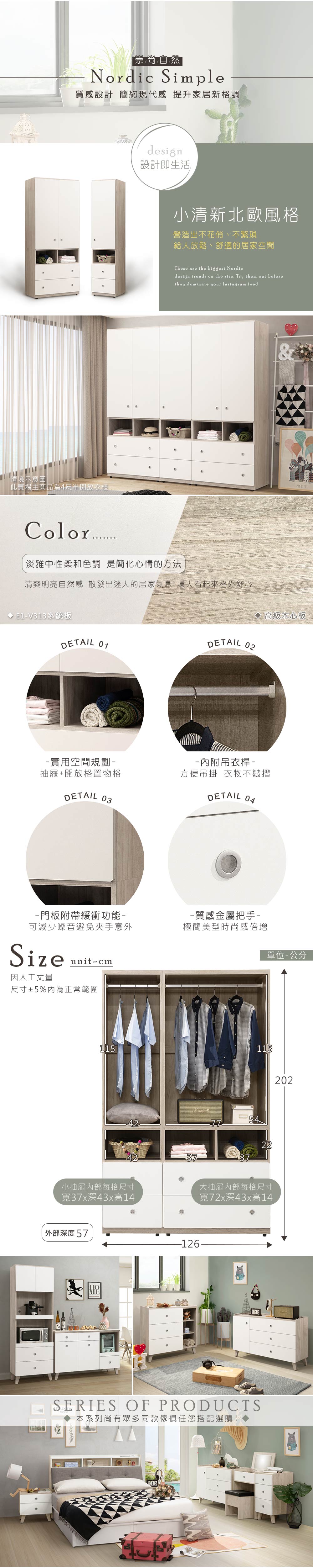 ◆淡雅色調,清新北歐風格◆門板緩衝後鈕,減少噪音◆吊衣桿+抽屜+開放格設計◆免組裝,由專人配送到府◆四抽屜收納空間尺寸:寬 126 x 深 57 x 高 202 公分材質:高級木心板、系統板顏色:北歐白產地:台灣誤差值:因人工丈量,尺寸±5%內為正常範圍