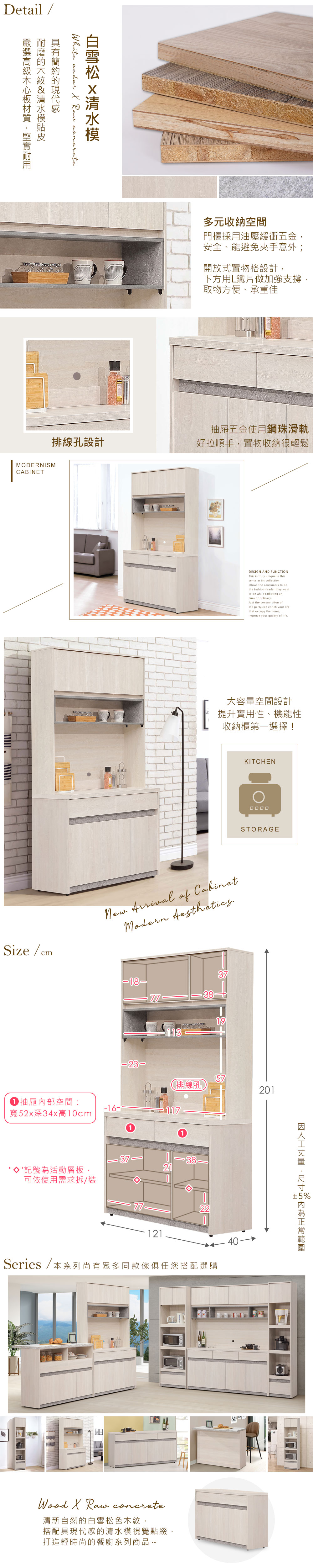 ◆嚴選高級的木心板材質◆附排線孔、活動層板*2◆開放格強化耐重、支撐設計◆免組裝,專人配送到府◆清新木紋x清水模拼色◆鋼刷耐磨貼皮,視覺觸感佳◆門片緩衝設計,抽屜鋼珠滑軌輕鬆開闔◆二抽屜+門片收納空間◆可當電器櫃、置物櫃、碗盤收納櫃尺寸:寬 121 x 深 40 x 高 201 公分材質:高級木心板顏色:白雪松+清水模產地:台灣誤差值:因人工丈量,尺寸±5%內為正常範圍
