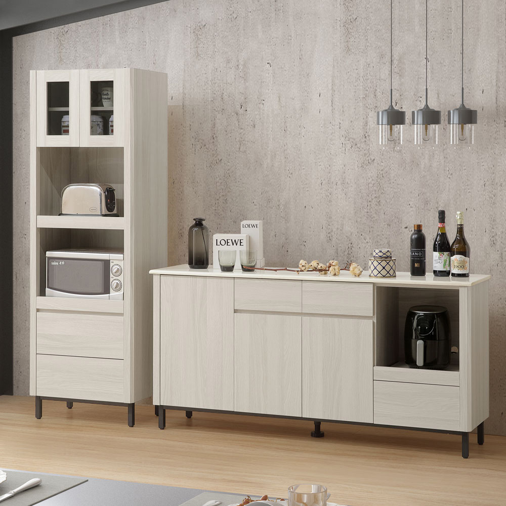 ◆木心板材質,堅實、穩固、耐用◆清新淺色系,質感木紋路視覺◆5mm強化灰色玻璃,美型、微透視感◆餐櫃檯面岩板材質,防刮、耐磨、好清潔◆門片使用緩衝五金,開合安全、避免夾手◆門櫃+抽屜的防塵收納規劃◆拉盤設計,附排線孔,可放餐廚電器◆免組裝,專人配送到府餐櫃尺寸:寬 158 x 深 40 x 高 80 公分高櫃尺寸:寬 60 x 深 40 x 高 180 公分材質:高級木心板、岩板、5mm強化玻璃、鐵腳顏色:白榆木色產地:台灣誤差值:因人工丈量,尺寸±5%內為正常範圍