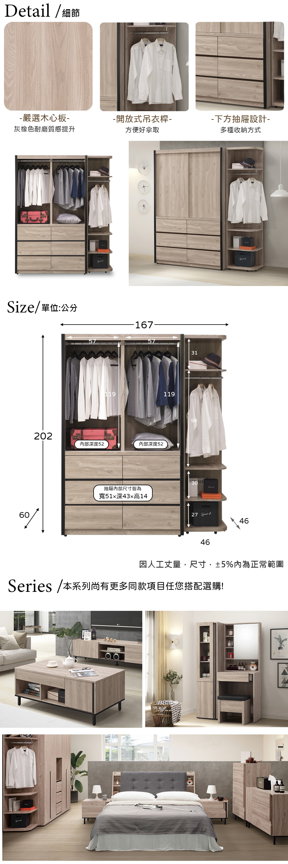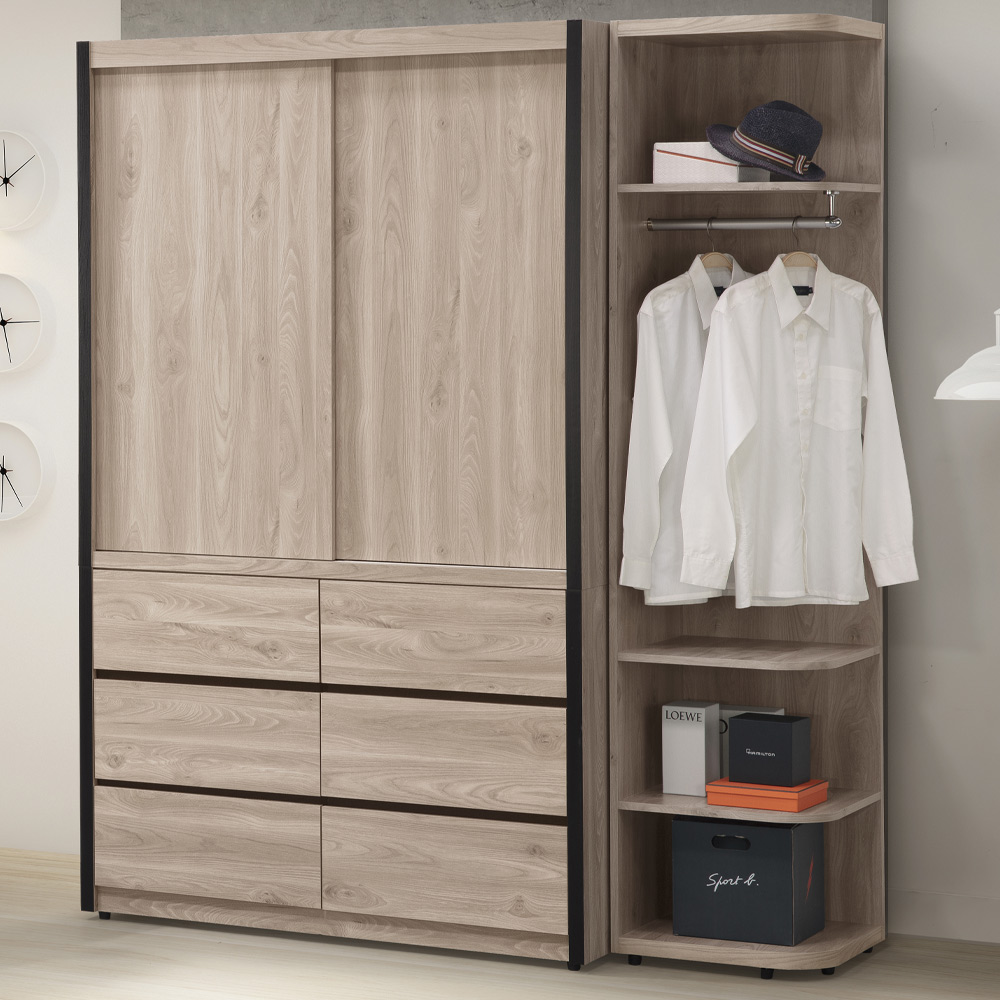 ◆開放式吊衣,取物超便利◆MIT鋼珠滑軌,開闔不費力◆滑門設計,精簡您的空間◆免自行組裝,專人配送到府◆現代、英倫灰橡風格◆更衣室、臥室提升整潔個人空間◆側邊開放邊櫃,臨時吊掛皆方便◆大容量衣櫥,下方六大抽屜收納尺寸:寬 167 x 深 60 x 高 202 公分材質:高級木心板顏色:灰橡色產地:台灣誤差值: 因人工丈量,尺寸±5%內為正常範圍