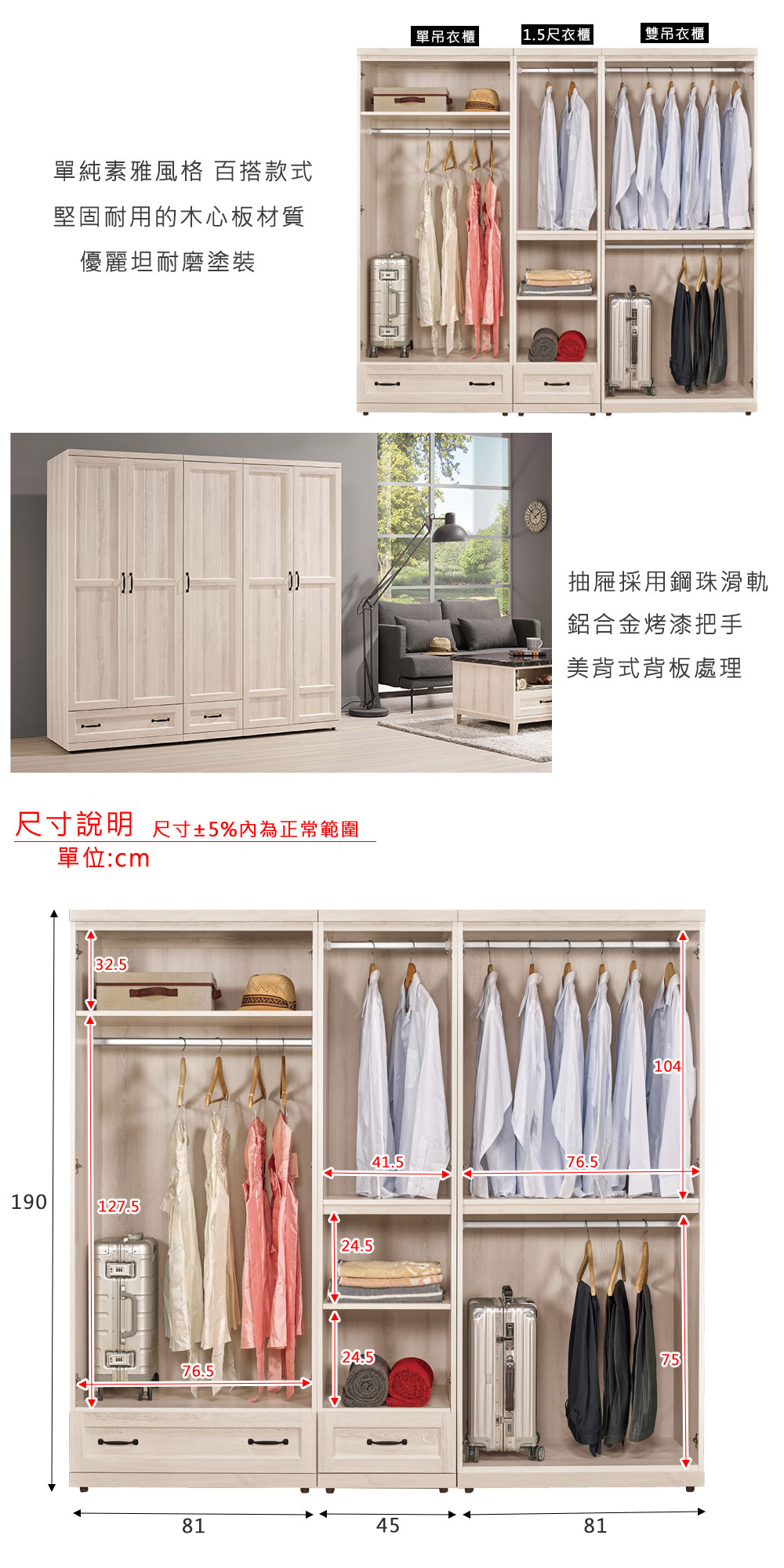 ◆ MIT鋼珠滑軌,開闔不費力◆表面優麗坦耐磨塗裝,防潑水◆超大空間,再多衣物也不怕◆免自行組裝,專人配送到府◆現代、日式風格◆臥室、更衣室大容量衣物存放◆四吊衣桿、二抽屜、被櫃多元收納方式尺寸:寬 207 x 深 58 x 高 190 公分材質:高級木心板顏色:洗白木紋產地:台灣誤差值:因人工丈量,尺寸±5%內為正常範圍