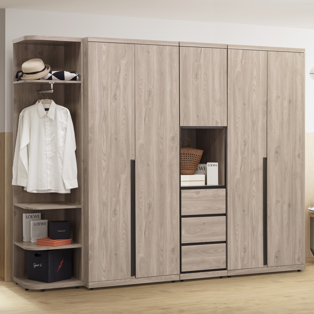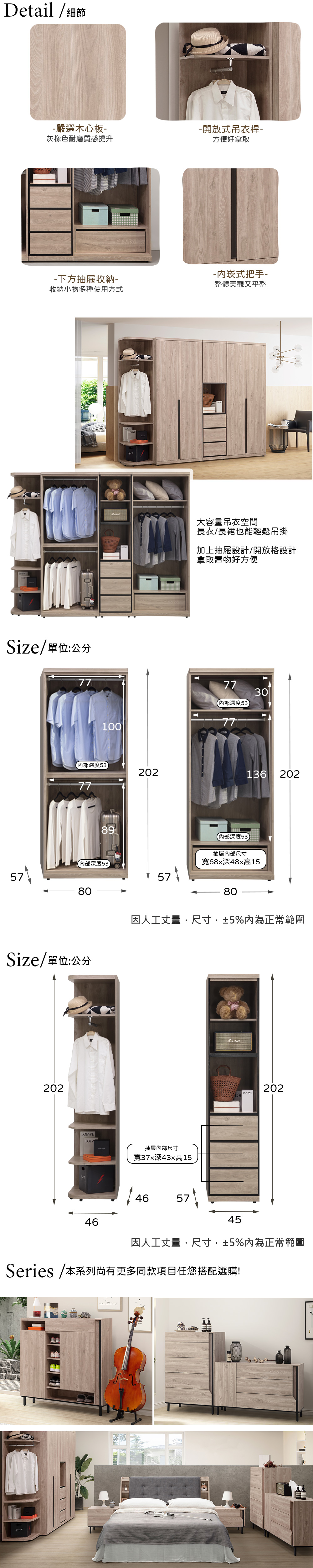 ◆隱藏式金屬把手,減少碰撞◆嚴選MIT高級木心板材質◆開放式空間,取物超便利◆免自行組裝,專人配送到府◆現代、英倫灰橡風格◆更衣室、臥室提升整潔個人空間◆吊掛、抽屜收納,多元好使用◆側邊開放邊櫃,臨時吊掛皆方便尺寸:寬 251 x 深 57 x 高 202 公分材質:高級木心板顏色:灰橡色產地:台灣誤差值: 因人工丈量,尺寸±5%內為正常範圍