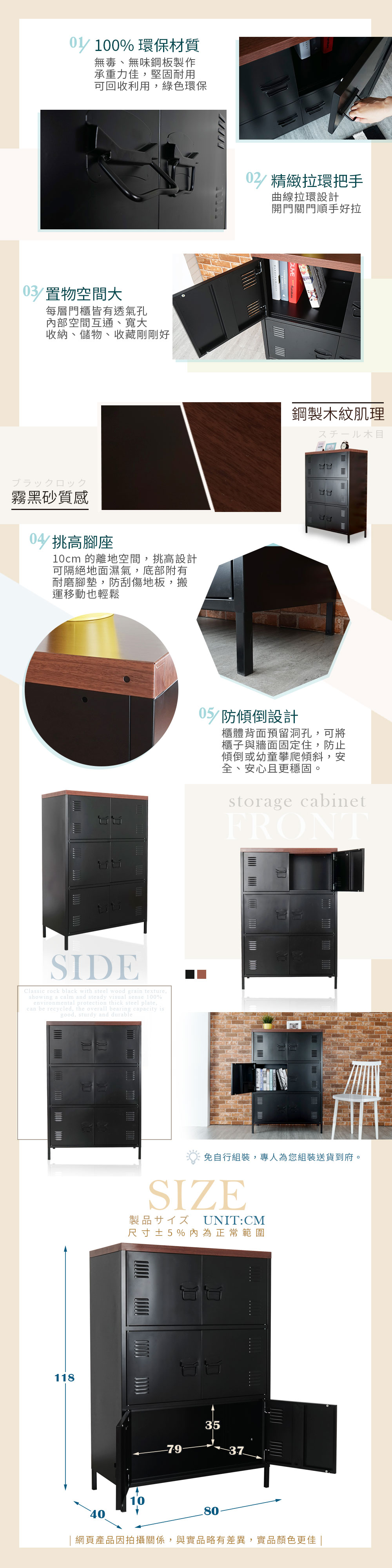 尺寸:寬 80 x 深 40 x 高 118 cm材質:鋼板烤漆顏色:搖滾黑產地:中國誤差值:因人工丈量,尺寸±5%內為正常範圍