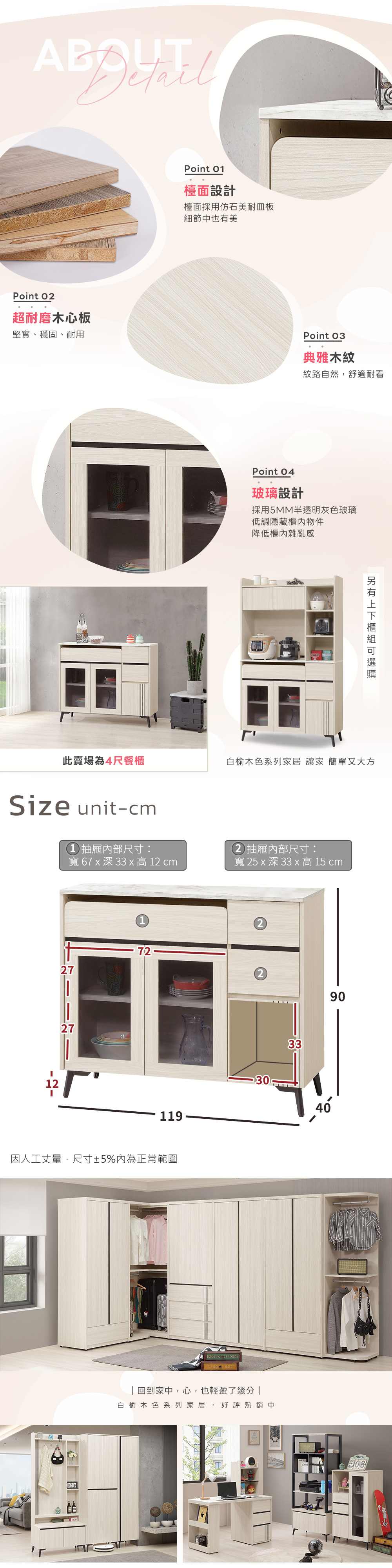 ◆白榆現代、英倫風格◆檯面採用仿石美耐皿板設計◆採半透明灰色玻璃◆免自行組裝,專人配送到府尺寸:寬 119 x 深 40 x 高 90 公分材質:高級木心板+仿石美耐皿板顏色:白榆木色產地:台灣誤差值: 因人工丈量,尺寸±5%內為正常範圍