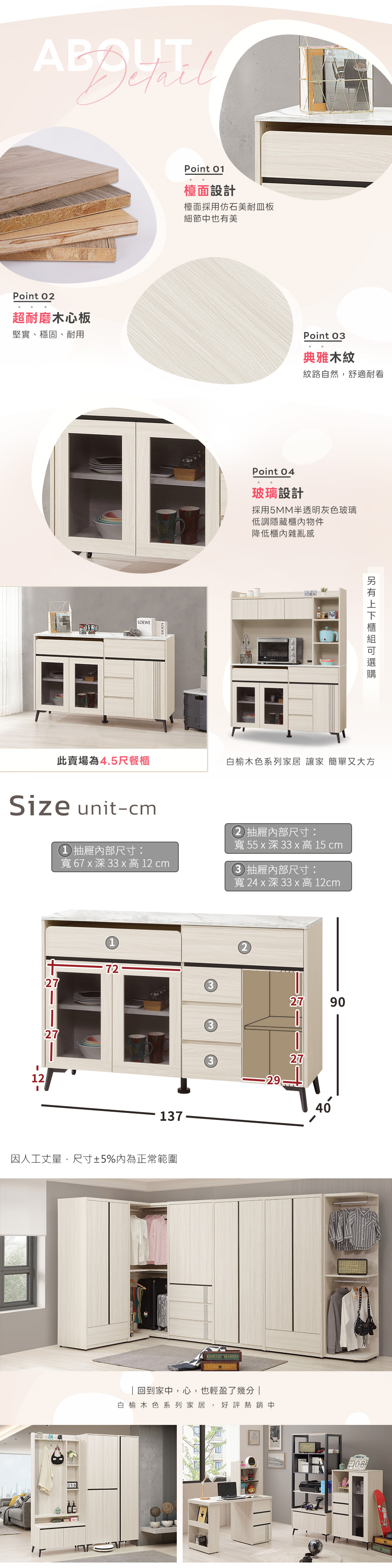 尺寸:寬 137 x 深 40 x 高 90 公分材質:高級木心板+仿石美耐皿板顏色:白榆木色產地:台灣誤差值: 因人工丈量,尺寸±5%內為正常範圍