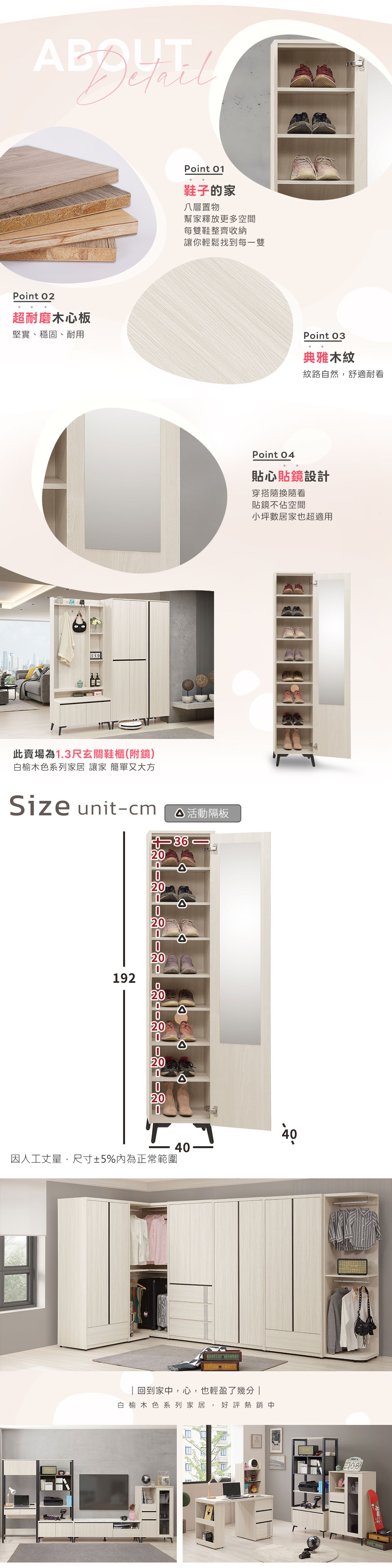 ◆白榆現代、英倫風格◆八層置物空間◆活動層板,依需求調整高度◆免自行組裝,專人配送到府尺寸:寬 40 x 深 40 x 高 192 公分材質:高級木心板顏色:白榆木色產地:台灣誤差值: 因人工丈量,尺寸±5%內為正常範圍
