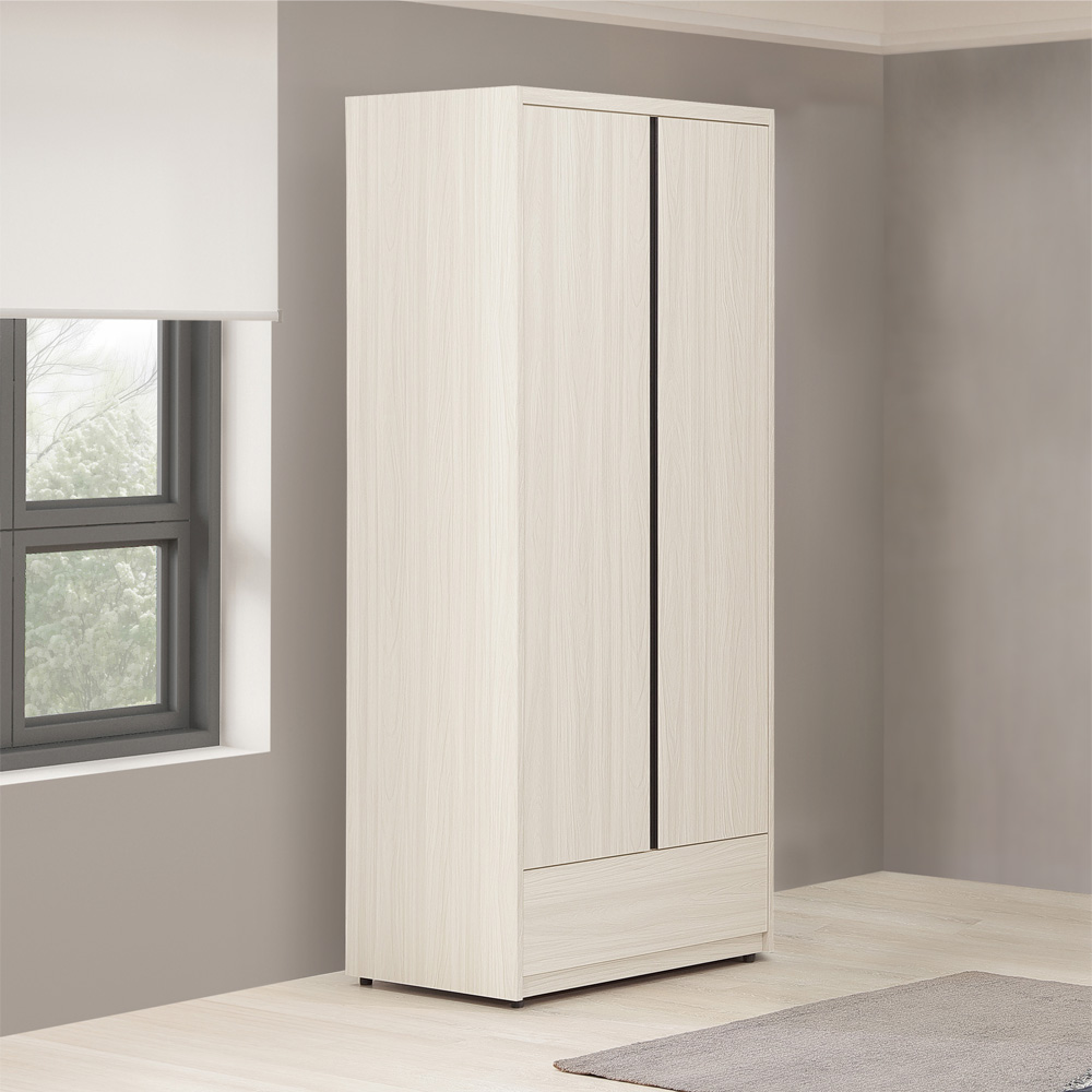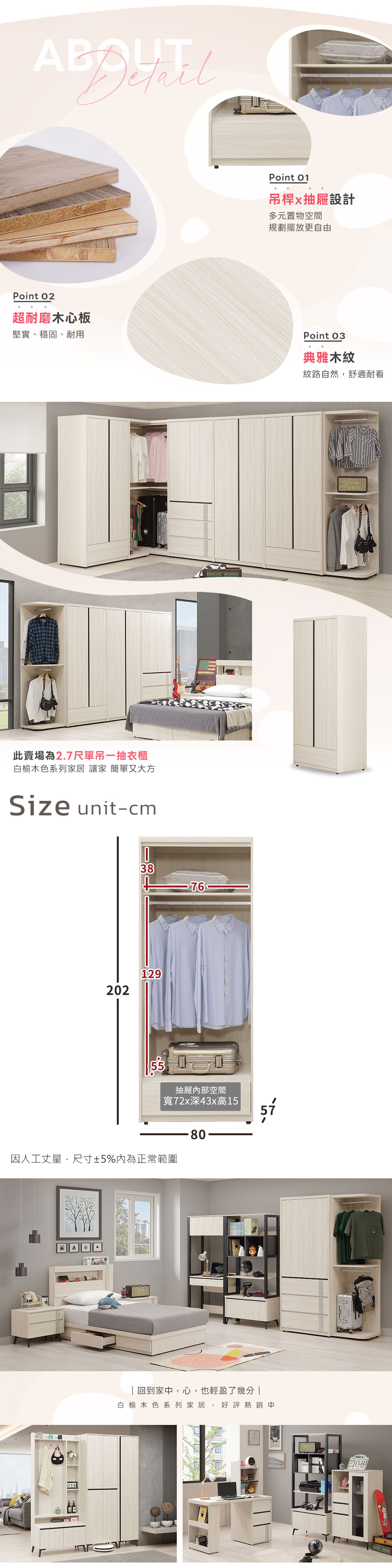 ◆木心板材質,堅實、穩固、耐用◆吊桿設計,衣服好掛不易起皺◆門片使用緩衝五金,開合安全◆下方抽屜,折疊衣物好收納◆白榆現代、英倫風格◆免組裝,專人配送到府尺寸:寬 80 x 深 57 x 高 202 公分材質:高級木心板顏色:白榆木色產地:台灣誤差值:因人工丈量,尺寸±5%內為正常範圍