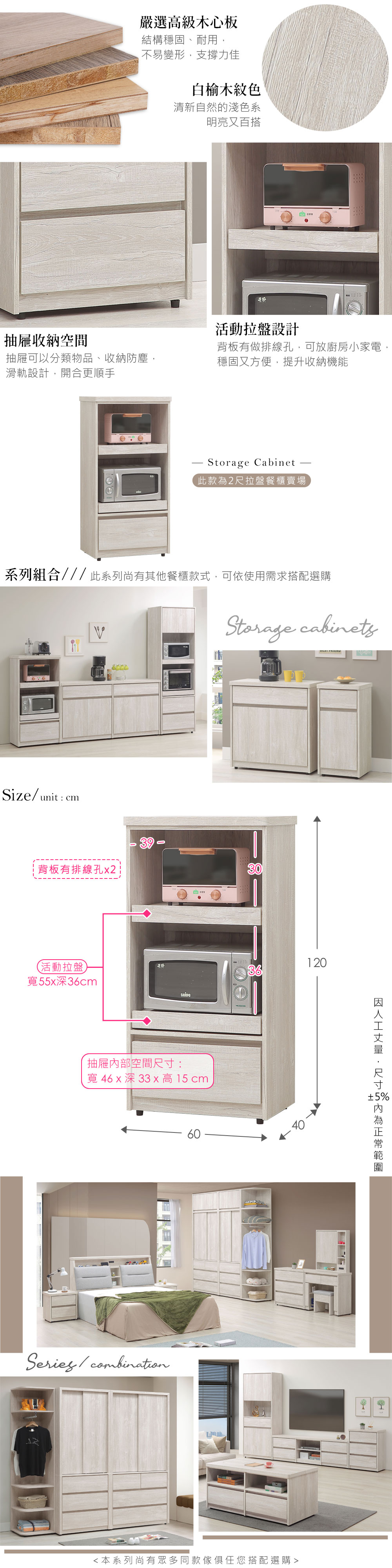 ◆木心板材質,堅實、穩固、耐用◆清新淺色系,質感木紋路視覺◆無把手設計,極簡美觀◆抽屜設計,分類物品、收納防塵◆拉盤設計,附排線孔,可放餐廚電器◆免組裝,由專人宅配到府尺寸:寬 60 x 深 40 x 高 120 公分材質:高級木心板顏色:白榆木色產地:台灣誤差值:因人工丈量,尺寸±5%內為正常範圍