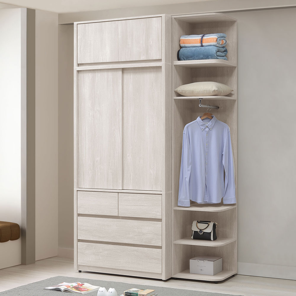 ◆木心板材質,堅實、穩固、耐用◆清新淺色系,質感木紋路視覺◆推門式設計,節約空間◆雙吊衣桿,方便吊掛衣物◆下方抽屜空間,能分類衣物、收納防塵◆側邊開放式轉角櫃,方便隨手掛、隨手取◆上方被櫃收納空間,容量升級◆免組裝,由專人宅配到府尺寸:寬 153 x 深 60 x 高 250 公分材質:高級木心板顏色:白榆木色產地:台灣誤差值:因人工丈量,尺寸±5%內為正常範圍