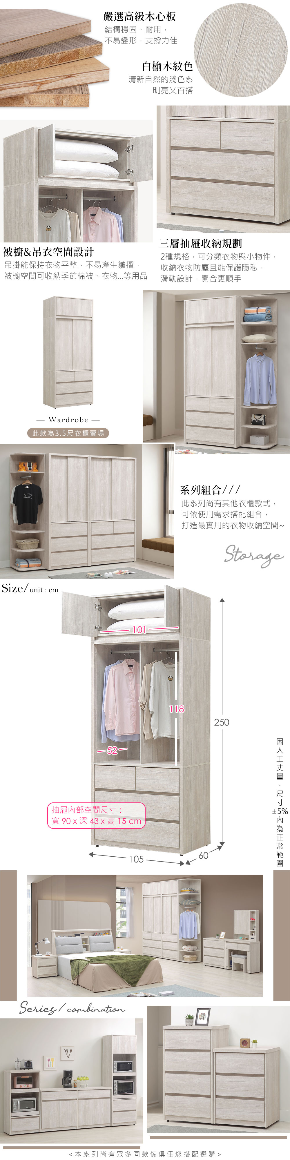 ◆木心板材質,堅實、穩固、耐用◆清新淺色系,質感木紋路視覺◆推門式設計,節約空間◆雙吊衣桿,方便吊掛衣物◆下方抽屜空間,能分類衣物、收納防塵◆上方被櫃收納空間,容量升級◆免組裝,由專人宅配到府尺寸:寬 105 x 深 60 x 高 250 公分材質:高級木心板顏色:白榆木色產地:台灣誤差值:因人工丈量,尺寸±5%內為正常範圍
