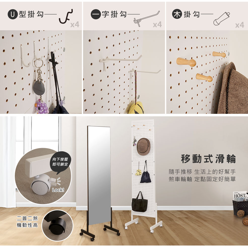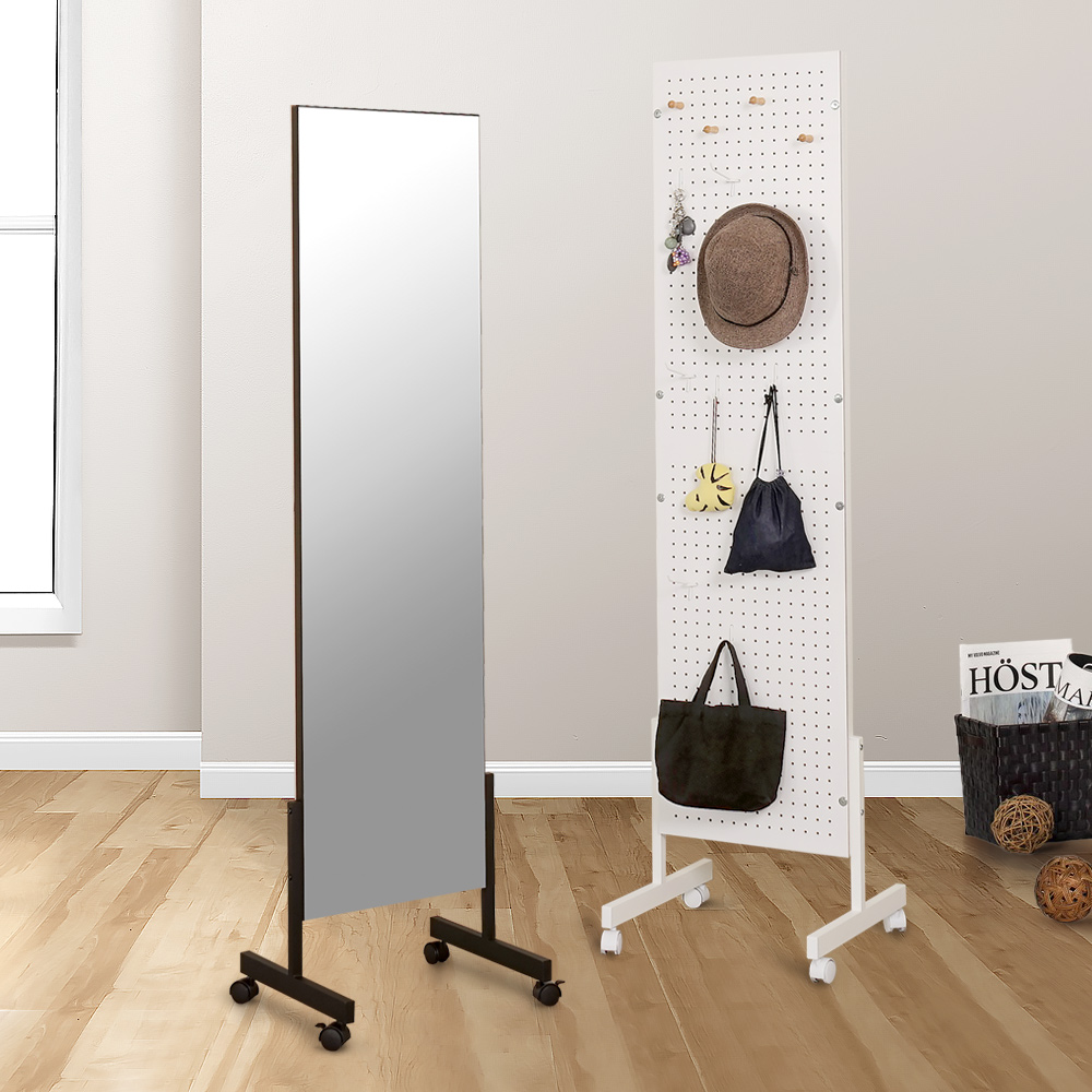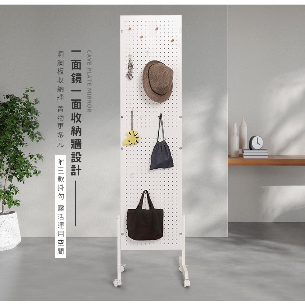 ◆多功能,一面鏡一面收納牆 ◆二普二煞,移動式滑輪設計 ◆洞洞板收納牆,置物更多元 ◆附三款掛勾,靈活運用空間 ◆多元機能,超大鏡面全身鏡 ◆時尚經典黑白色,不退流行