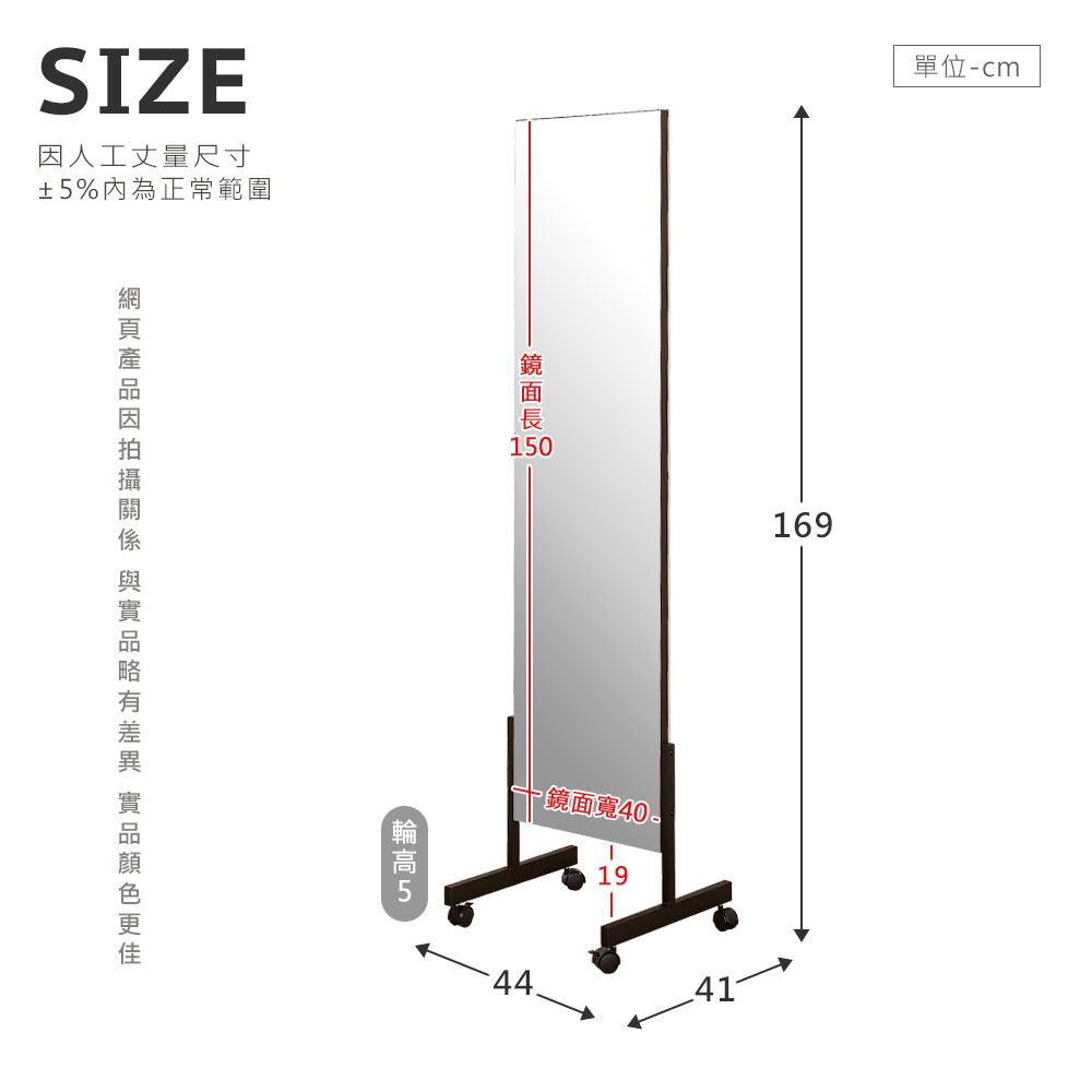 尺寸:寬 44 x 深 41 x 高 169 公分 材質:MDF板、銀鏡、鐵管粉體烤漆 顏色:黑色 產地:台灣 誤差值:因人工丈量,尺寸±5%內為正常範圍