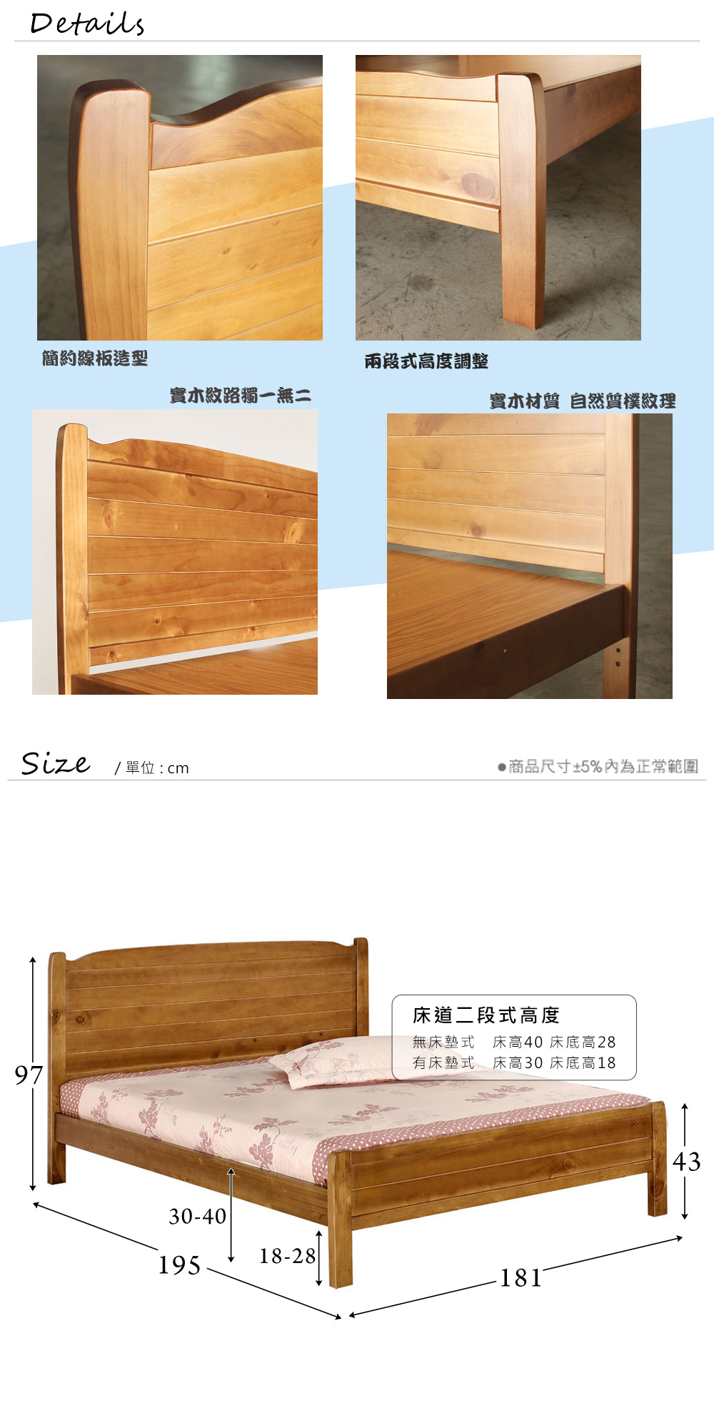 ◆簡約悠閒峇里島風◆優質松木實木打造◆床道二段高度可調◆專人配送到府組裝◆床鋪下方掃地機器人打掃容易整組配件─ 6尺床頭片 + 6尺床架 (不含床墊)整組尺寸─ 長 195 x 寬 181 x 高 97 公分材質─ 松木實木+4分床板顏色─ 淺褐色產地─ 台灣誤差值─ 因人工丈量,尺寸±5%內為正常範圍