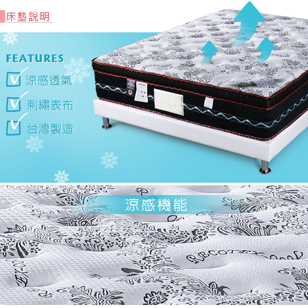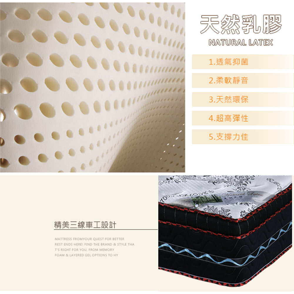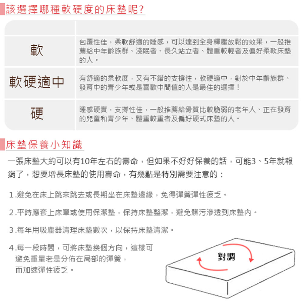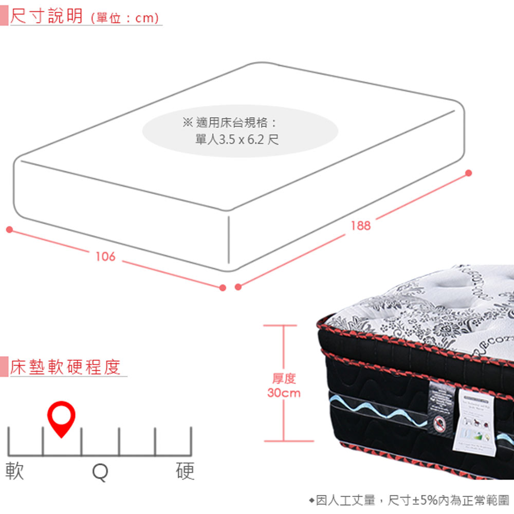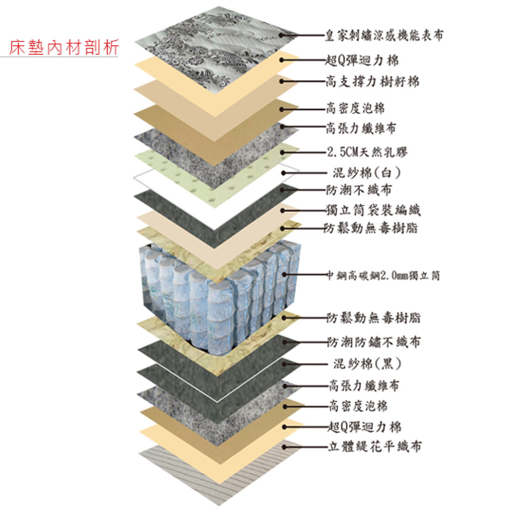 ◆2.5cm天然乳膠◆刺繡涼感機能表布◆2.0mm高碳鋼獨立筒◆專人配送,到府安裝◆床墊軟硬度:軟Q◆厚度30公分材質說明: 第一層-皇家刺繡涼感機能表布 第二層-超Q彈迴力棉 第三層-高支撐力樹籽棉 第四層-高密度泡棉 第五層-高張力纖維棉 第六層-2.5cm天然乳膠 第七層-混紗棉(白) 第八層-防潮不織布 第九層-獨立筒袋裝編織 第十層-防鬆動無毒樹脂 第十一層-中鋼高碳鋼2.0mm獨立筒 第十二層-防鬆動無毒樹脂 第十三層-防潮防鏽不織布 第十四層-混紗棉(黑) 第十五層-高張力纖維布 第十六層-高密度泡棉 第十七層-超Q彈迴力棉 第十八層-立體緹花平織布 產地:台灣誤差值:因人工丈量,尺寸±5%內為正常範圍