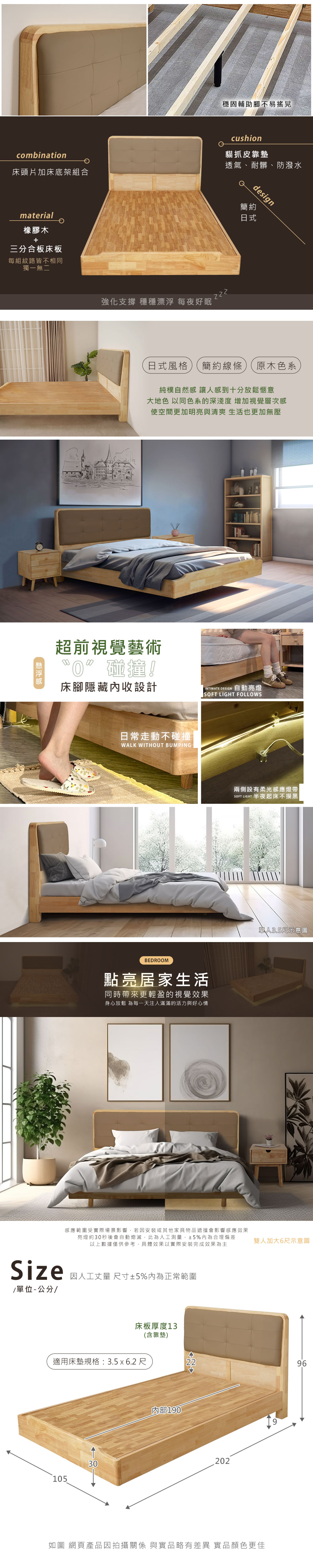 ◆懸浮設計,會發光的床◆床腳內收,打造懸浮感◆兩側設有柔光感應燈帶◆感應式光源半夜不摸黑◆漂浮床,超前視覺藝術◆嚴選穩固耐用的橡膠木◆耐磨、防刮貓抓皮靠墊◆自然大地色系原木色系◆日式風格,清新簡約感◆免組裝由專人配送到府整組配件:3.5尺床頭片 + 3.5尺床架 (不含床墊)尺寸:長 202 x 寬 105 x 高 96 公分材質:貓抓皮、橡膠木、三分合板床板顏色:原木色產地:中國適用床墊規格:3.5 x 6.2尺誤差值:因人工丈量,尺寸±5%內為正常範圍