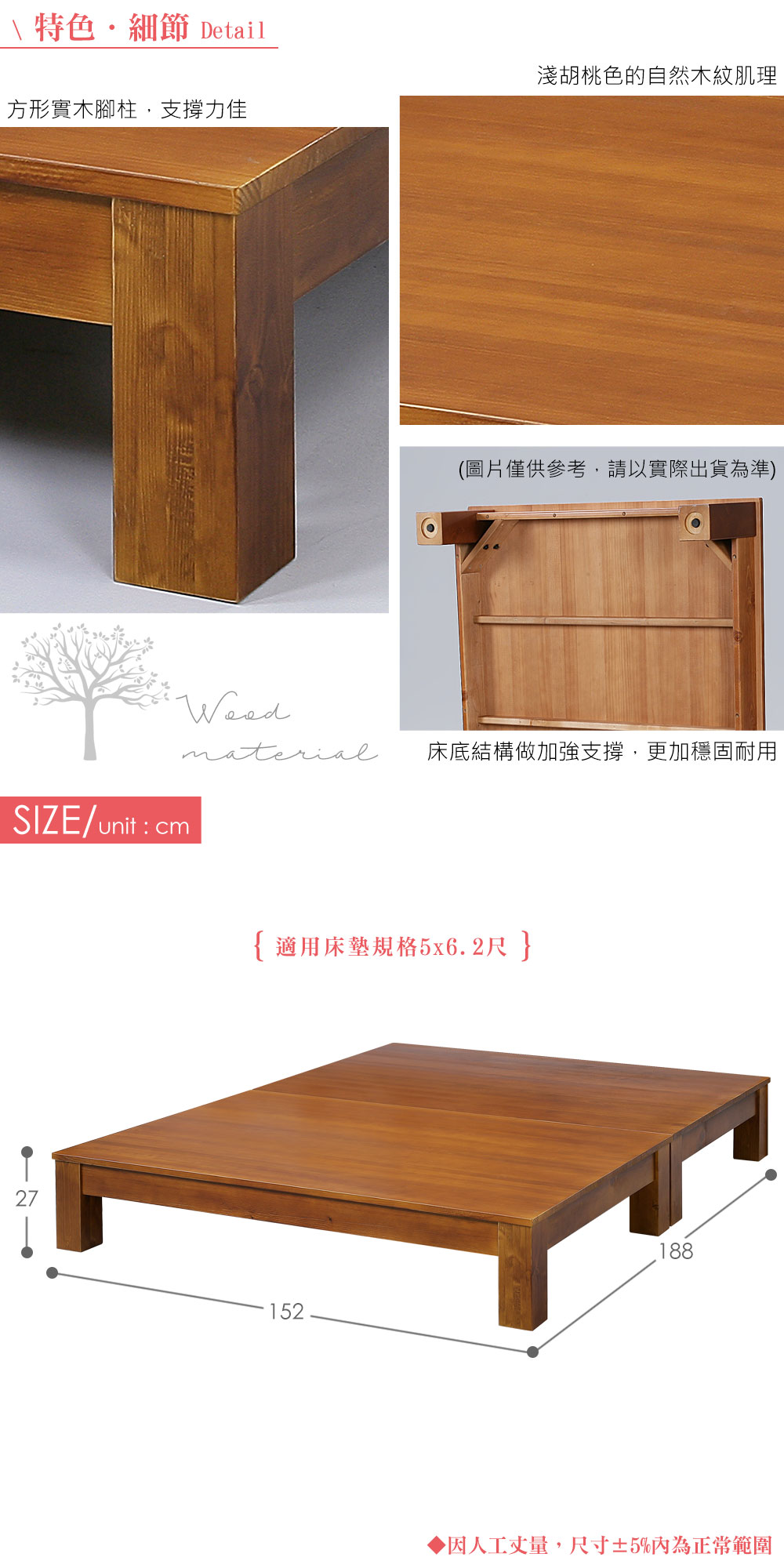◆嚴選松木實木材質◆結構設計穩固耐用◆免組裝,專人送到府◆日式、田園系風格◆溫馨實木質感臥室◆床架高度27公分尺寸:寬 152 x 深 188 x 高 27 公分(床下高度16公分)適用床墊規格:5 x 6.2 尺材質:松木實木顏色:淺胡桃色產地:台灣誤差值:因人工丈量,尺寸±5%內為正常範圍