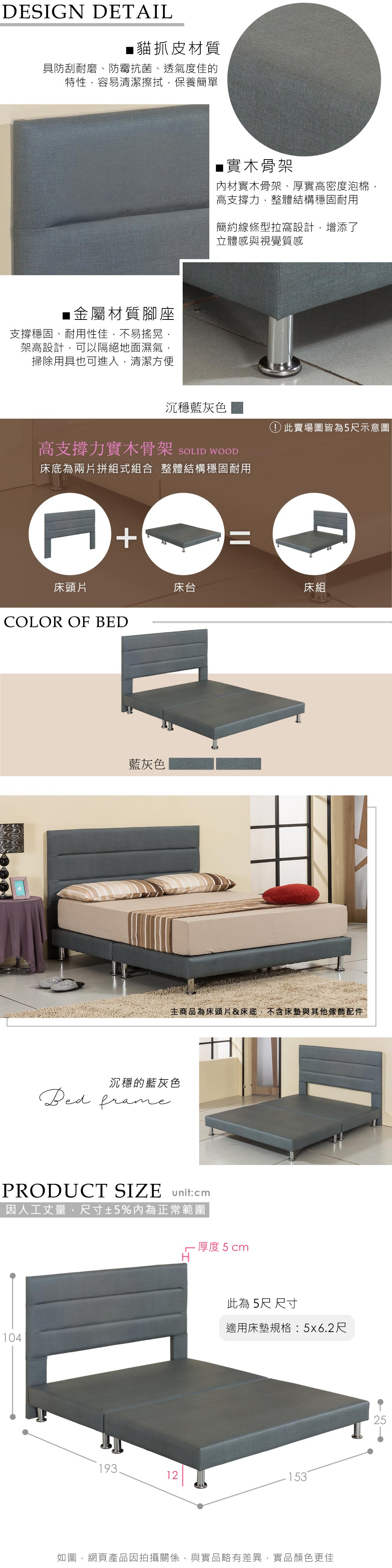 ◆耐磨、防刮貓抓皮材質◆日式簡約的線條拉窩設計◆厚實舒適的高密度泡棉◆免組裝,專人配送到府◆日式、現代風格◆提升臥室設計感◆床頭片+床架◆挑高床架遠離地面濕氣整組配件:5尺床頭片 + 5尺床台尺寸:寬 153 x 深 193 x 高 104 公分材質:貓抓皮、高密度泡棉、夾板、塑膠腳柱※腳柱圖片為舊款,新款改為厚塑膠材質顏色:藍灰色產地:台灣誤差值:因人工丈量,尺寸±5%內為正常範圍