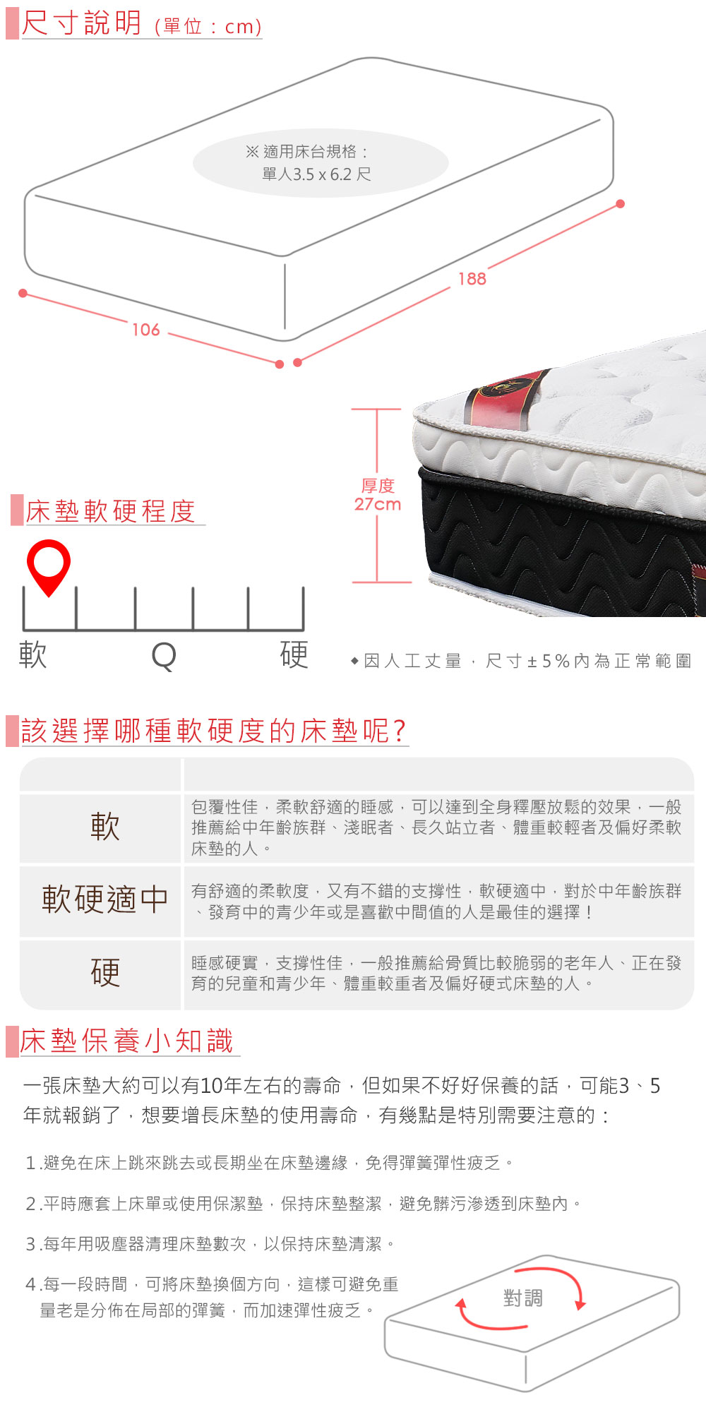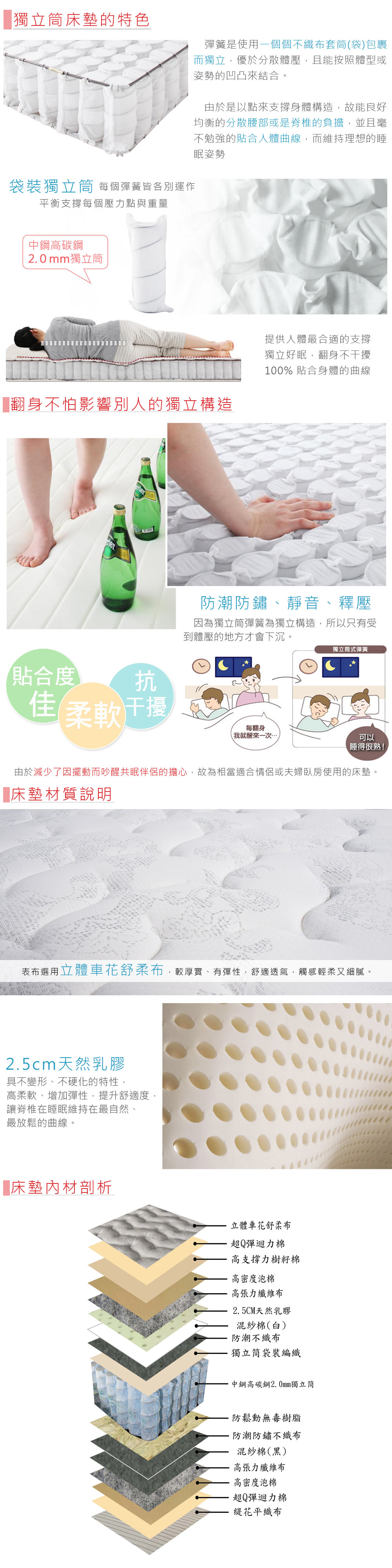 ◆2.5cm高柔軟天然乳膠◆立體車花的舒柔表布◆MIT台灣製造好品質◆專人配送,到府安裝◆2.0mm中鋼高碳鋼獨立筒◆床墊軟硬度:偏軟◆厚度27公分尺寸:寬 106 x 長 188 x 厚 27 公分材質說明:第一層-立體車花舒柔布第二層-超Q彈迴力棉第三層-高支撐力樹籽棉第四層-高密度泡棉第五層-高張力纖維布第六層-2.5cm天然乳膠第七層-混紗棉(白)第八層-防潮不織布第九層-獨立筒袋裝編織第十層-中鋼高碳鋼2.0mm獨立筒第十一層-防鬆動無毒樹脂第十二層-防潮防鏽不織布第十三層-混紗棉(黑)第十四層-高張力纖維布第十五層-高密度泡棉第十六層-超Q彈迴力棉第十七層-緹花平織布產地:台灣誤差值:因人工丈量,尺寸±5%內為正常範圍