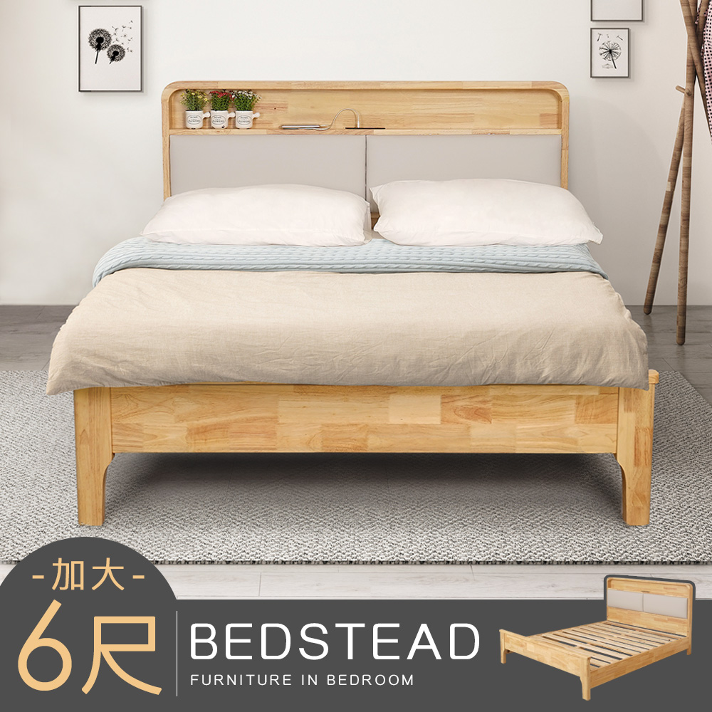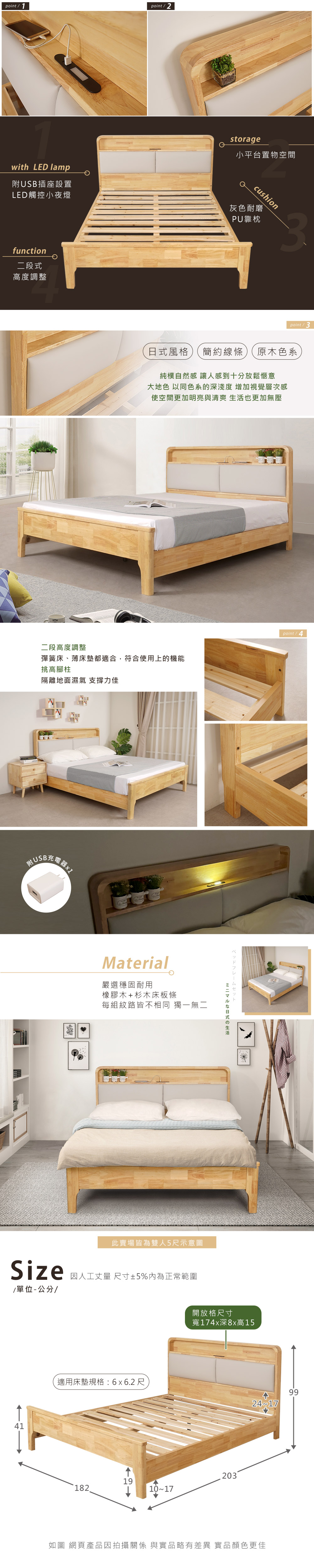 ◆床頭附USB插座設置◆LED觸控床頭小夜燈◆小平台置物空間設計◆灰色耐磨PU舒適靠枕◆嚴選穩固耐用橡膠木◆挑高腳柱,支撐力佳◆自然大地色原木色調◆日式風格,清新簡約◆床架二段式高度調整◆床頭片加床底架組合◆免組裝專人配送到府整組配件:6尺床頭片 + 6尺床架 (不含床墊)尺寸:長 203 x 寬 182 x 高 99 公分材質:橡膠木+杉木床板條+PU顏色:原木色產地:中國適用床墊規格:6 x 6.2尺誤差值:因人工丈量,尺寸±5%內為正常範圍