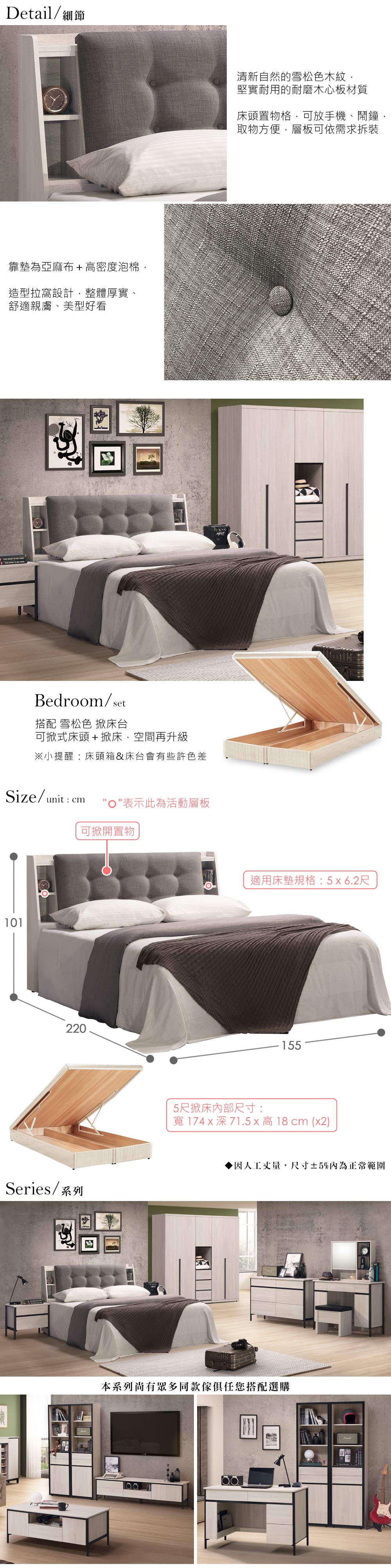 ◆舒適、厚實的床頭靠墊◆左右開放式置物空間設計◆可掀式床頭+掀床,收納升級◆免組裝專人配送到府◆輕工業、北歐自然風格◆雙人床組,兩人剛剛好整組配件: 5尺床頭箱 + 5尺掀台(不含床墊)尺寸:寬 155 x 深 220 x 高101 公分適用床墊:5 x 6.2 尺材質:高級木心板顏色:白雪松產地:台灣誤差值:因人工丈量,尺寸±5%內為正常範圍