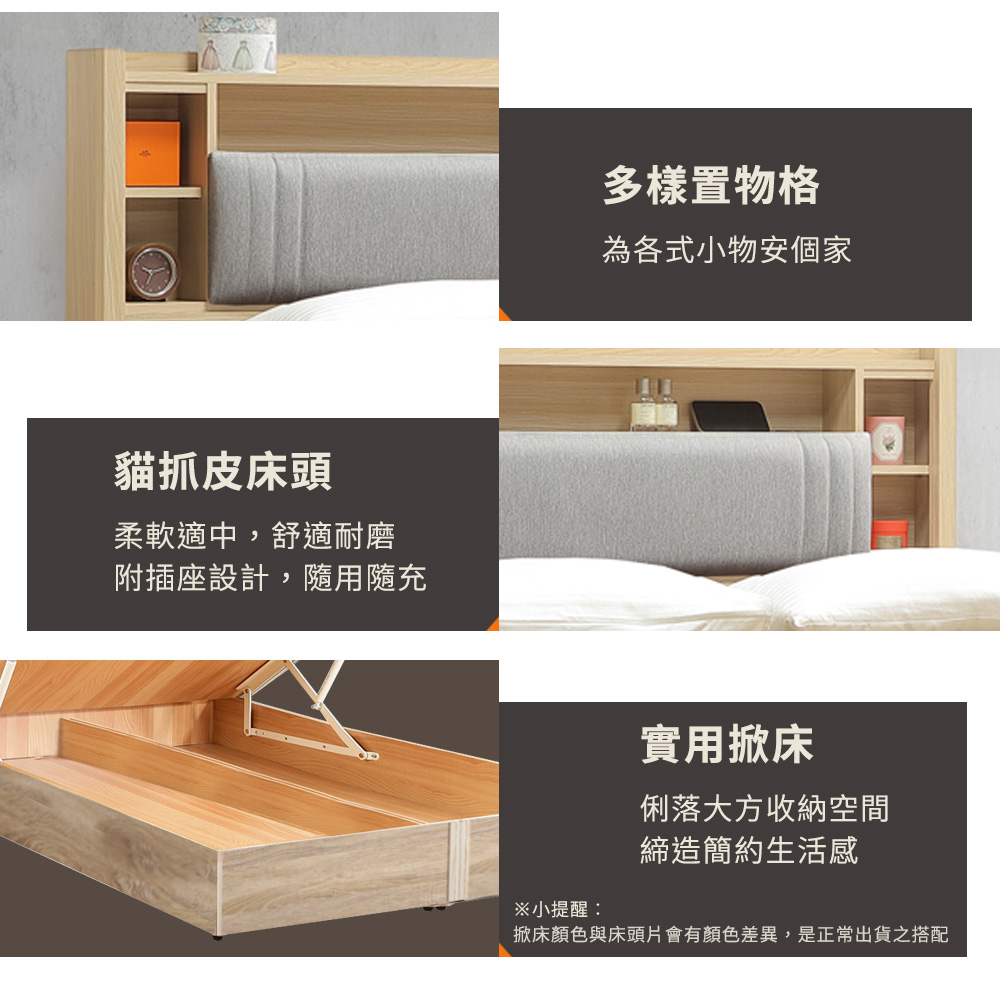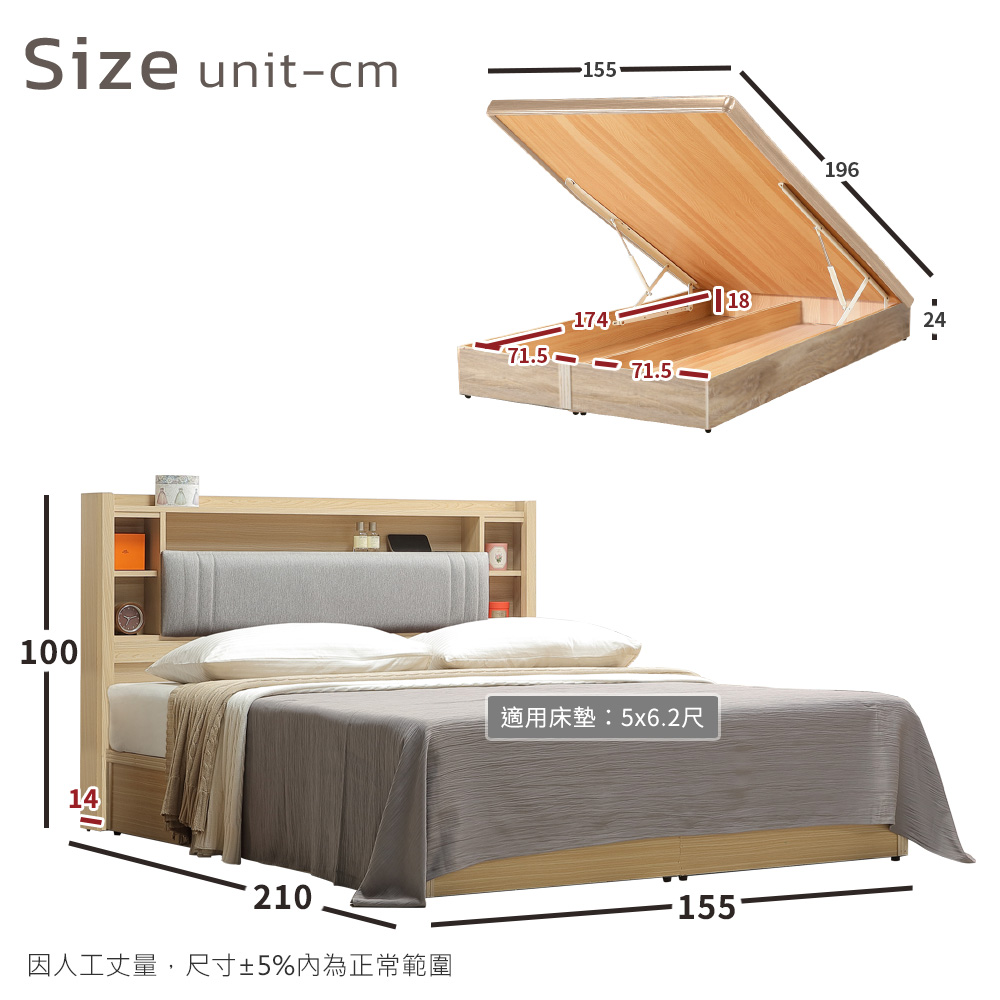 ◆木心板材質,堅實、穩固、耐用◆典雅木紋,演繹大器沉穩◆貓抓皮床頭,大幅增加靠感舒適度◆床頭安全插座,充電超方便◆搭配大空間掀床底,收納一目了然◆免組裝,專人配送到府整組商品:床頭片 x 1 + 掀床床台 x 1 (不含床墊)尺寸:寬 155 x 深 210 x 高 100 公分適用床墊規格:5 x 6.2 尺材質:高級木心板顏色:杉木色產地:台灣誤差值:因人工丈量,尺寸±5%內為正常範圍