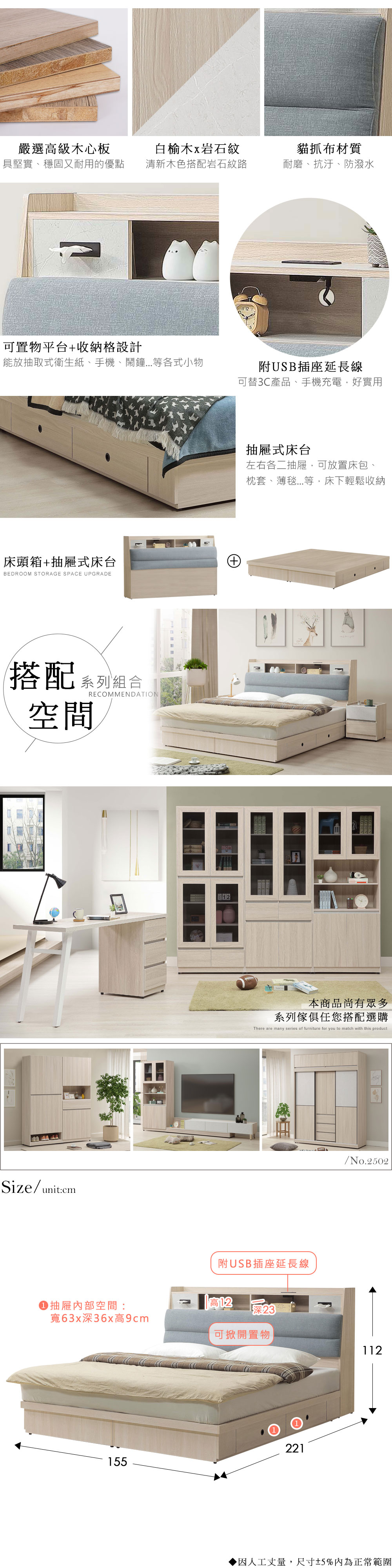 ◆嚴選高級木心板◆舒適、耐磨的貓抓布材質靠墊◆附USB、面紙收納格,實用多功能◆四抽屜床底設計,可放置各式小物◆清新的淺色系搭配自然木紋肌理◆掀式床頭箱,大空間,可做被櫥使用◆免自行組裝,專人配送到府整組商品:床頭箱 x 1 + 抽屜床底 x 1尺寸:寬 155 x 深 221 x 高 112 公分適用床組規格:5 x 6.2 尺材質:高級木心板、貓抓布靠墊、美耐皿顏色:白榆木雙色產地:台灣誤差值:因人工丈量,尺寸±5%內為正常範圍