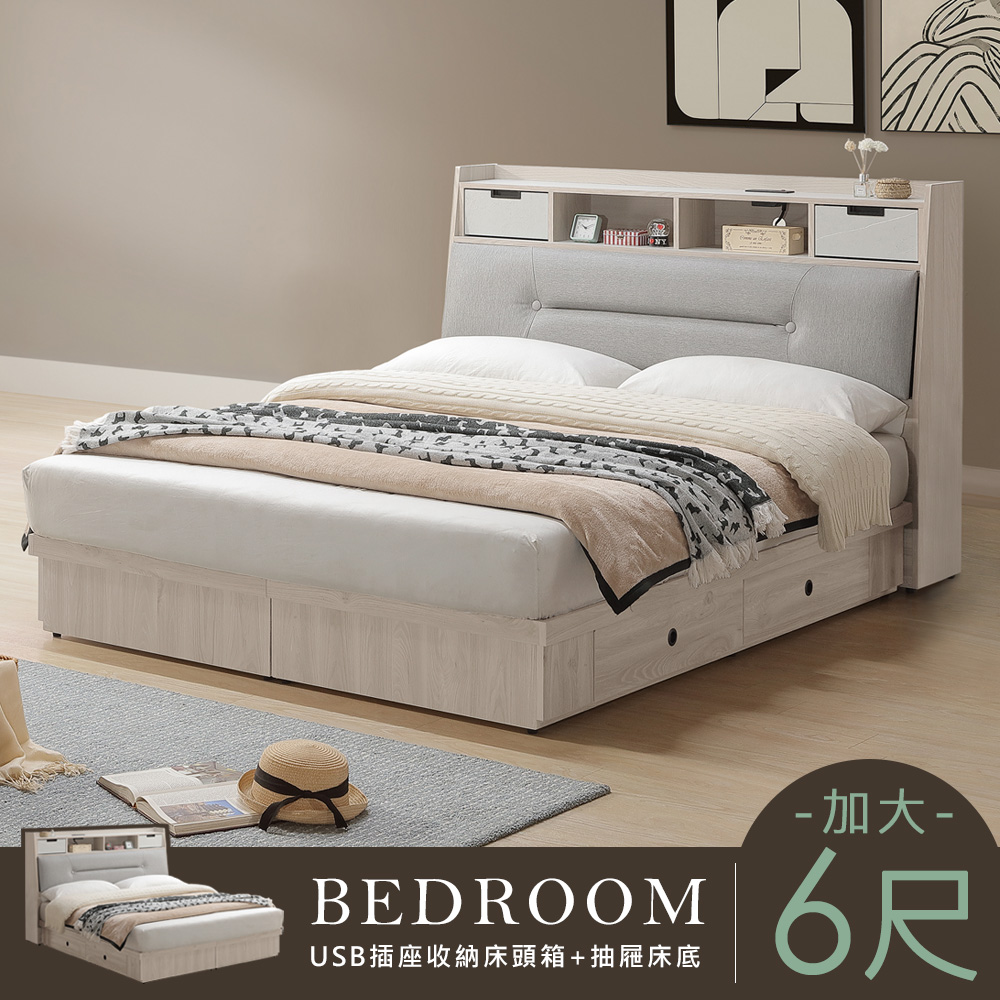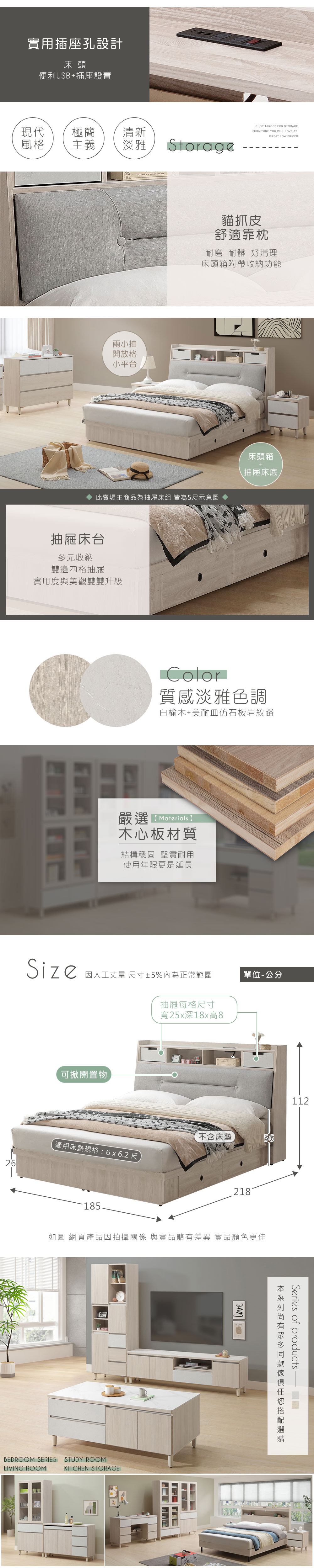 ◆床頭附USB插座設置◆床頭箱附帶收納功能◆二抽小平台置物空間◆雙邊收納四抽屜床台◆貓抓皮舒適厚實靠枕◆嚴選木心板耐用材質◆美耐皿仿石板岩紋路◆白榆木清新淡雅色調◆床頭箱+抽屜床底組合◆免組裝專人配送到府整組配件:6尺床頭箱 + 6尺抽屜床台(不含床墊)尺寸:長 218 x 寬 185 x 高 112 公分材質:高級木心板、貓抓皮靠墊、美耐皿顏色:白榆木雙色產地:台灣適用床墊規格:6 x 6.2尺誤差值:因人工丈量,尺寸±5%內為正常範圍
