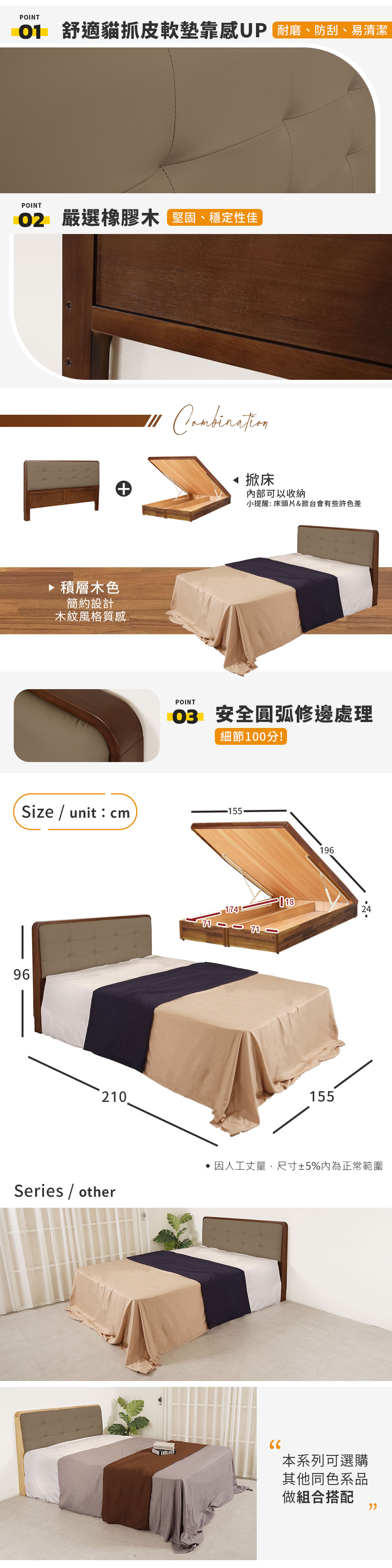 ◆嚴選穩固耐用的橡膠木◆耐磨、防刮貓抓皮靠墊◆日式風格,清新簡約感◆後掀床台設計收納多一倍◆免組裝由專人配送到府整組商品:5尺床頭片+5尺掀床台(不含床墊)尺寸:寬 155 x 深 210 x 高 96 公分適用床墊:5 x 6.2 尺床頭片材質:貓抓皮、橡膠木床台材質:木心板顏色:胡桃色 產地:台灣/ 中國誤差值:因人工丈量,尺寸±5%內為正常範圍