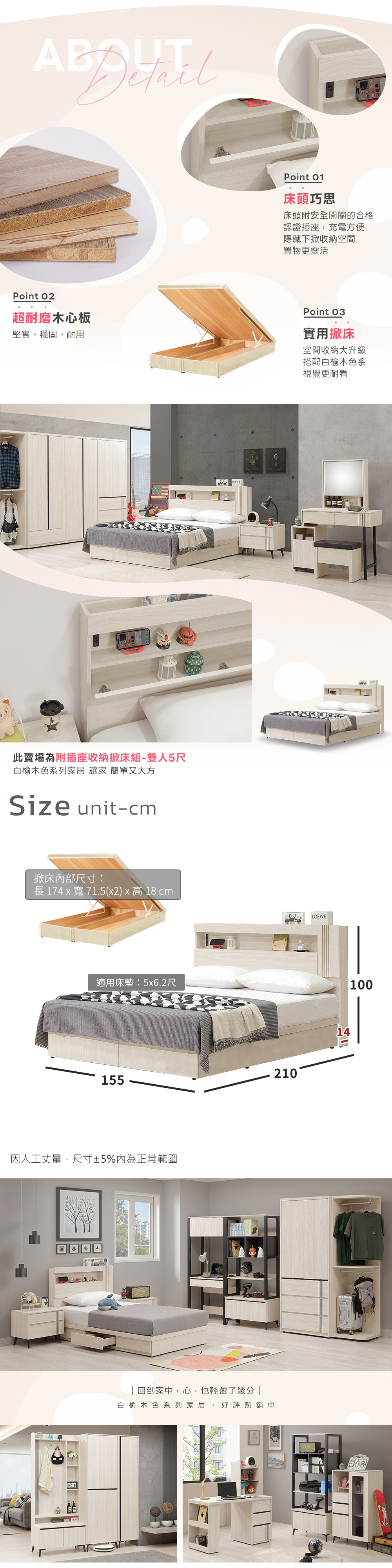 ◆白榆現代、英倫風格◆床頭附有插座,方便充電◆床頭隱藏下掀收納小物◆床頭片+掀床組合◆免自行組裝,專人配送到府整組商品:5尺床頭片 x 1 + 5尺掀床 x 1尺寸:寬 155 x 深 210 x 高 100 公分適用床組規格:5 x 6.2 尺材質:高級木心板顏色:白榆木色產地:台灣誤差值: 因人工丈量,尺寸±5%內為正常範圍