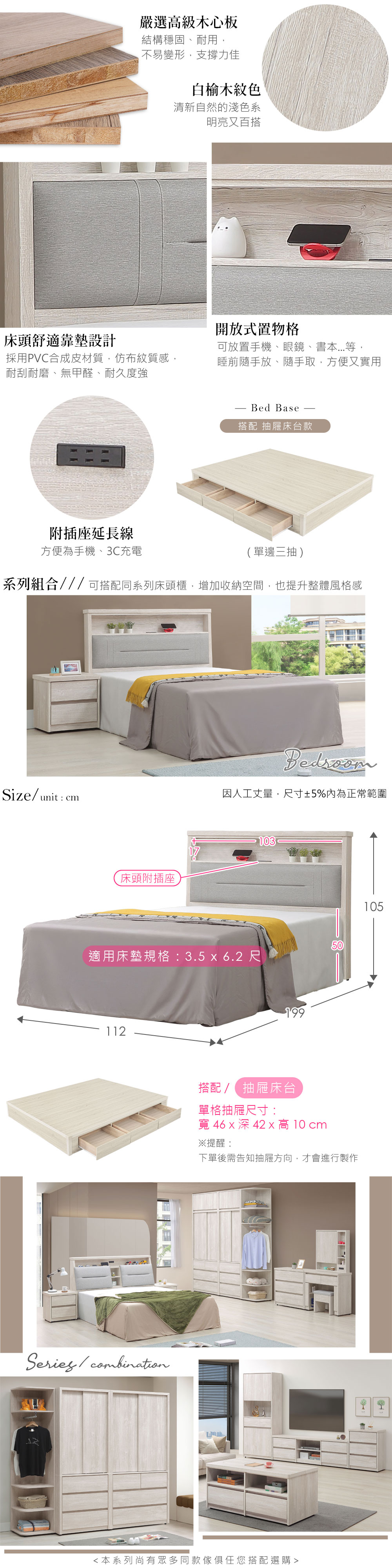 ◆木心板材質,堅實、穩固、耐用◆清新淺色系,質感木紋路視覺◆仿布紋質感的舒適 PVC皮靠墊◆床頭有置物格,增加收納空間◆附安全插座,手機、3C充電好方便◆搭配抽屜床台,分類收納好整齊!◆免組裝,專人配送到府整組商品:床頭片 x 1 + 抽屜床台 x 1 (不含床墊)尺寸:寬 112 x 深 199 x 高 105 公分適用床墊規格:3.5 x 6.2 尺材質:高級木心板、PVC皮、三分夾板顏色:白榆木色產地:台灣誤差值:因人工丈量,尺寸±5%內為正常範圍