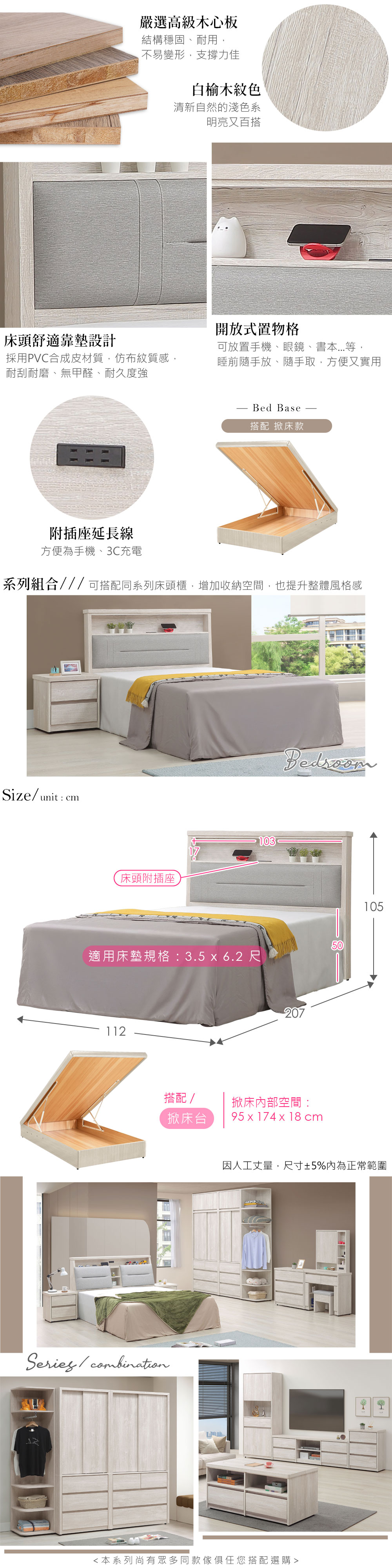 整組商品:床頭片 x 1 + 掀床 x 1 (不含床墊)尺寸:寬 112 x 深 207 x 高 105 公分適用床墊規格:3.5 x 6.2 尺材質:高級木心板、PVC皮顏色:白榆木色產地:台灣誤差值:因人工丈量,尺寸±5%內為正常範圍