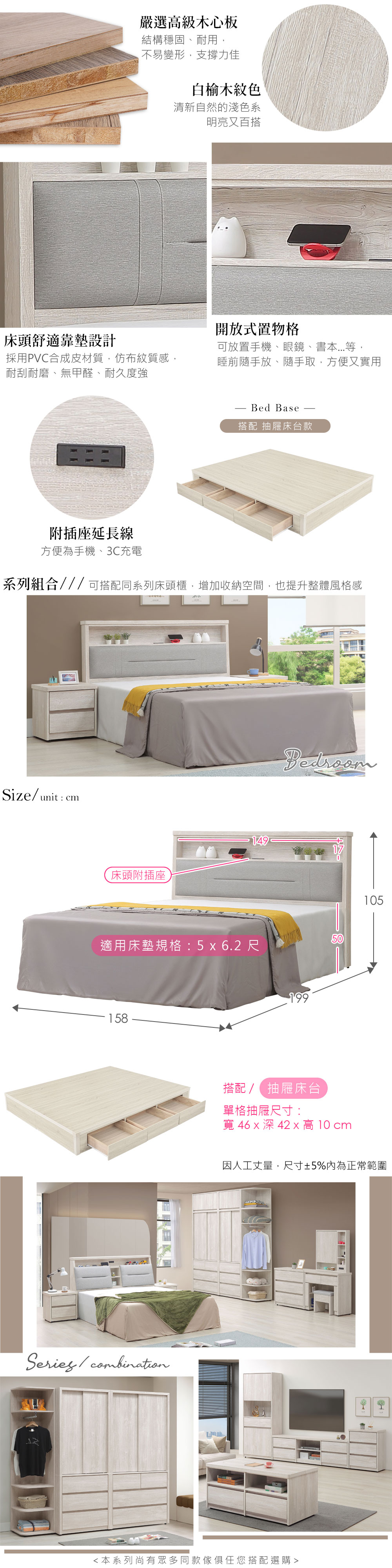 ◆木心板材質,堅實、穩固、耐用◆清新淺色系,質感木紋路視覺◆仿布紋質感的舒適 PVC皮靠墊◆床頭有置物格,增加收納空間◆附安全插座,手機、3C充電好方便◆搭配抽屜床台,共六抽屜,分類收納好整齊!◆免組裝,專人配送到府整組商品:床頭片 x 1 + 抽屜床台 x 1 (不含床墊)尺寸:寬 158 x 深 199 x 高 105 公分適用床墊規格:5 x 6.2 尺材質:高級木心板、PVC皮、三分夾板顏色:白榆木色產地:台灣誤差值:因人工丈量,尺寸±5%內為正常範圍
