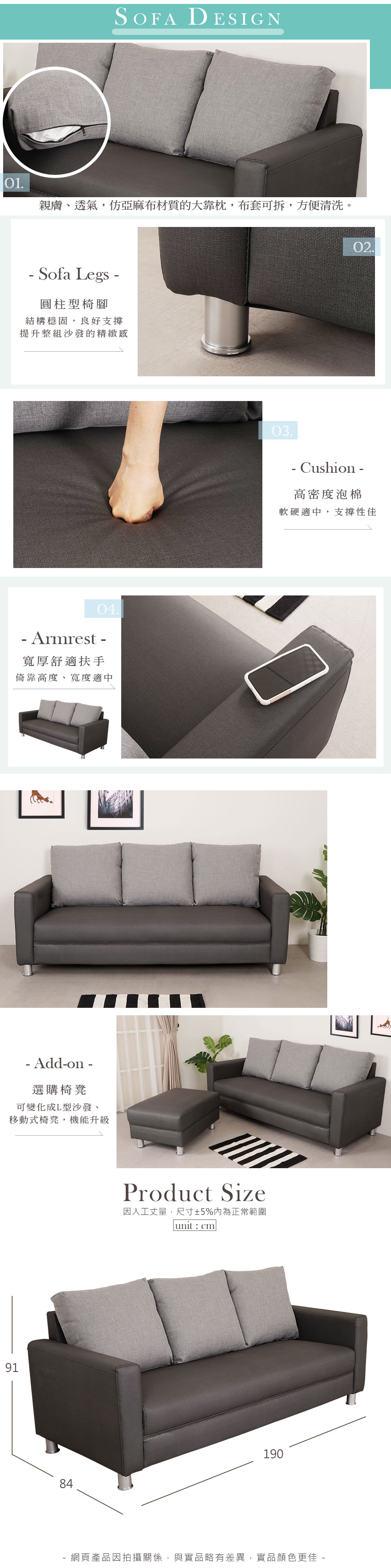 尺寸:寬 190 x 深 84 x 高 91 公分 材質:貓抓皮、高密度泡棉 顏色:炭灰色 產地: 台灣 誤差值: 因人工丈量,尺寸±5%內為正常範圍