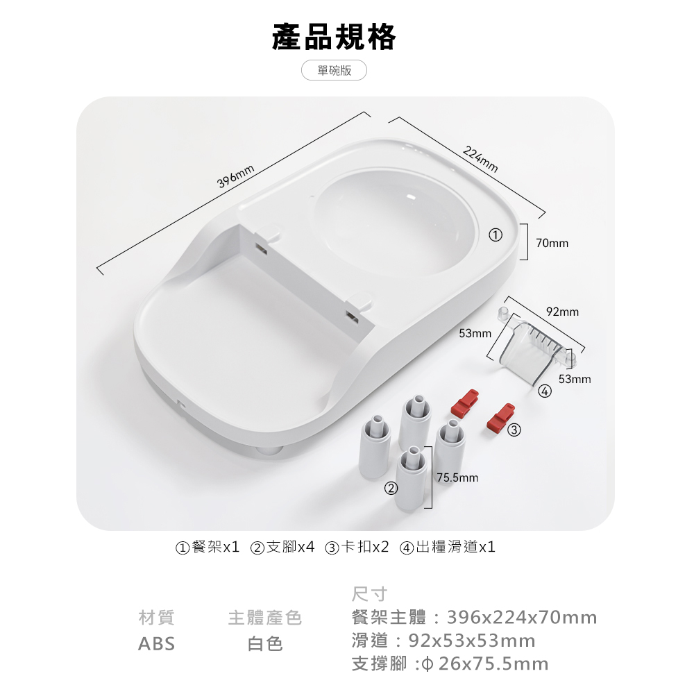 產品內容物:餐盤x1 支腳x4 卡扣x2 出糧滑道x1