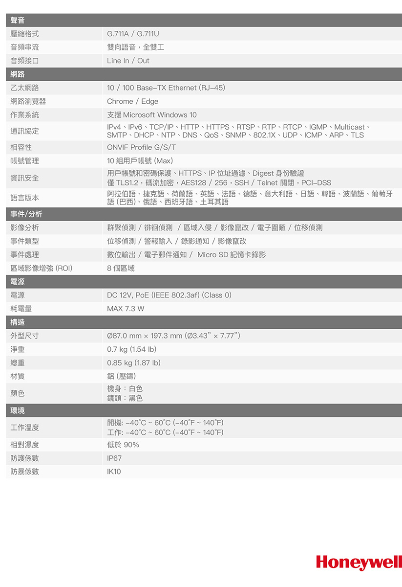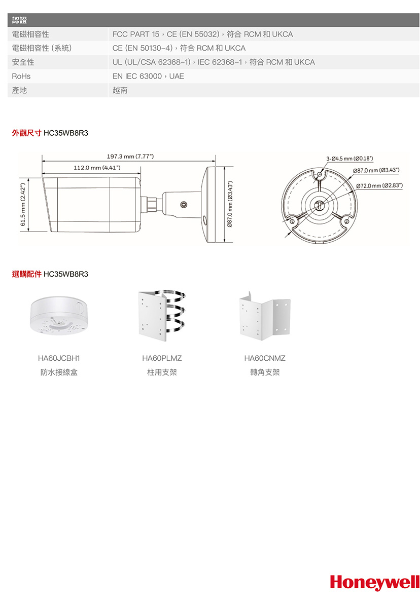 昌運監視器 Honeywell HC35WB8R3 800萬畫素 紅外線管型網路攝影機 紅外線40公尺 PoE供電